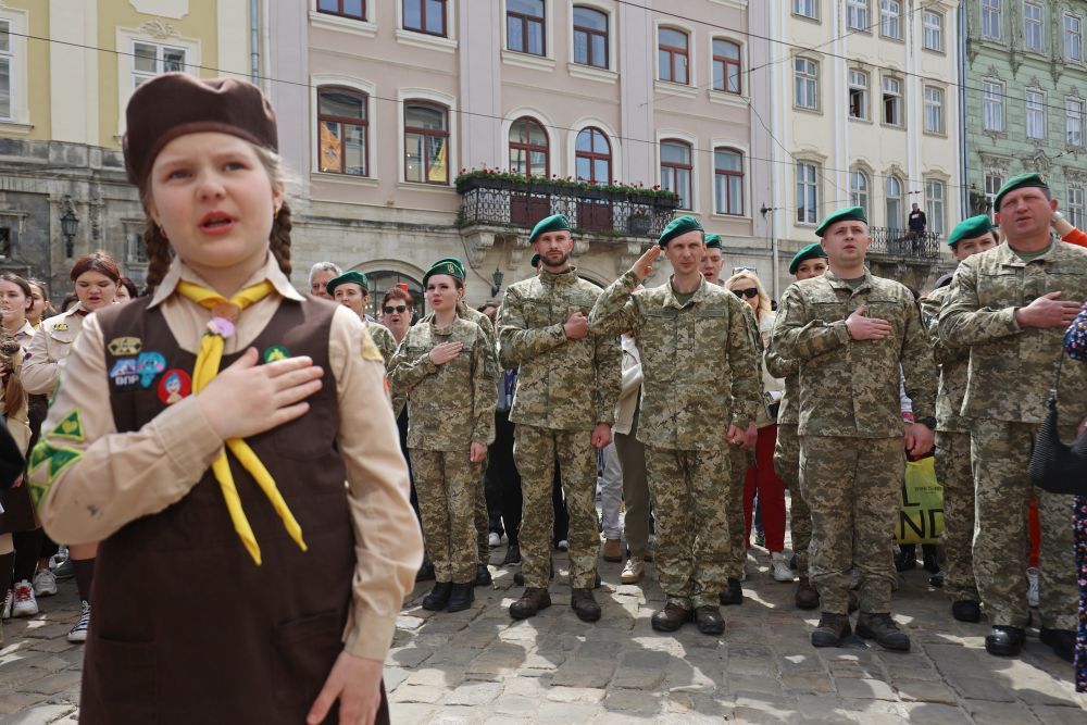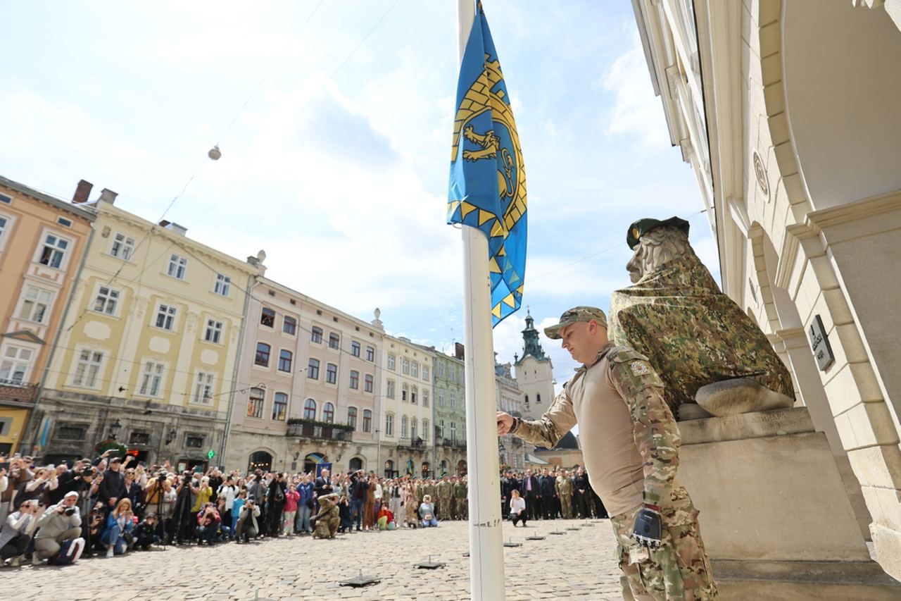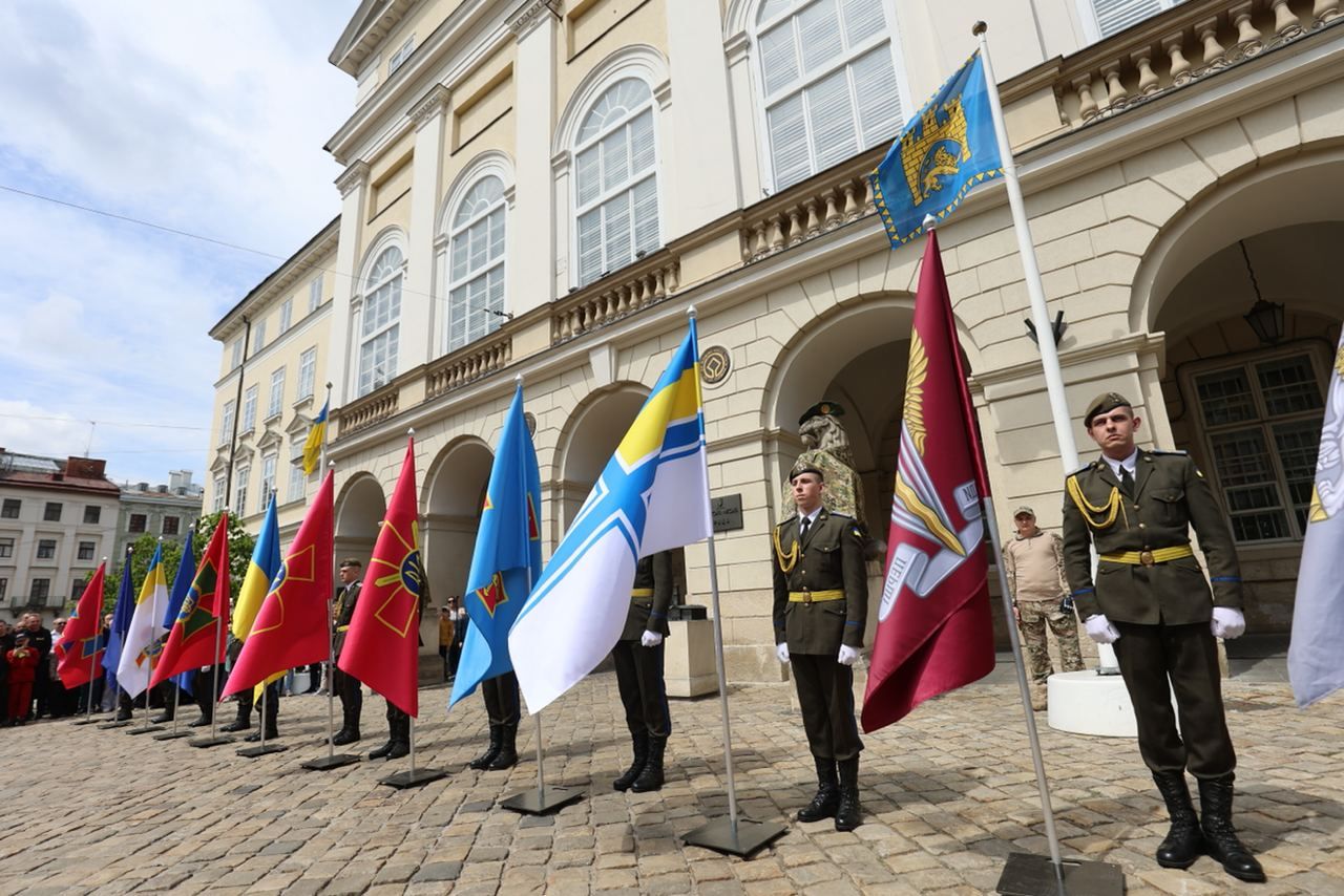 Мер Львова Андрій Садовий розповів, що на площі Ринок розгорнули штандарти усіх військових та оборонних структур України. Стяг Львова підняв український герой – військовий Роман Василюк, який лікується у львівському центрі UNBROKEN, пише 24 Канал.