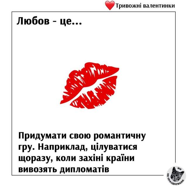 У фейсбуці "Ми не празднували" оприлюднили цілу колекцію "тривожних валентинок" про любов. Серед них є така: "любов – це замість подарунків перерахувати гроші на армію".