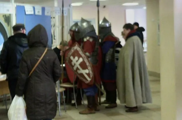 У Санкт-Петербурзі на виборчу ділянку з'явилася група лицарів в обладунках.