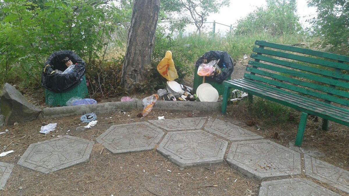 На світлинах видно, як сміття, серед якого багато пластикових пляшок та пакетів, розкидане прямо біля сміттєвих урн та лавочок. На деяких фото помітно, як відходи лежать поруч із навіть незаповненими урнами.