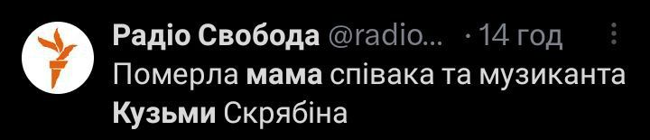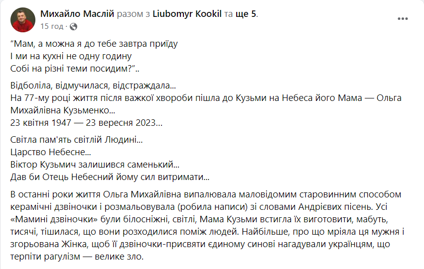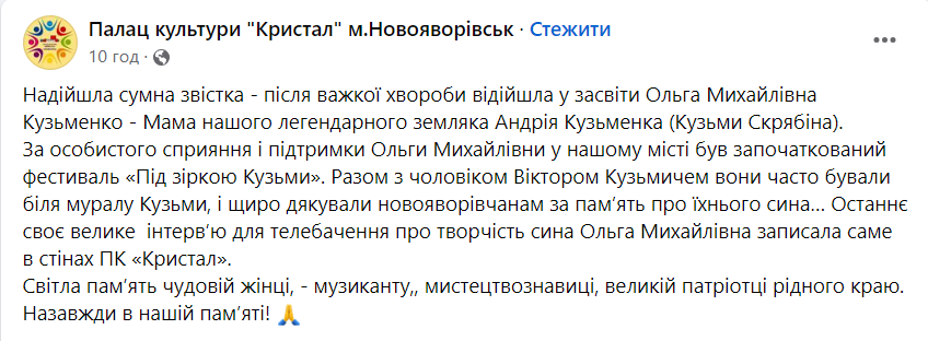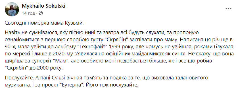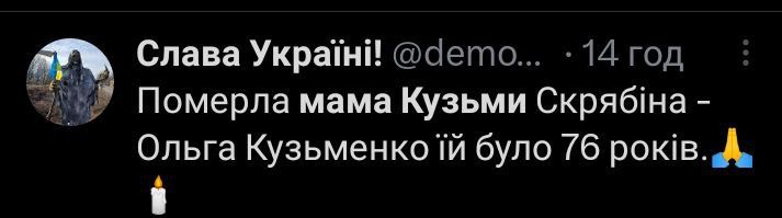 "Не стало Ольги Кузьменко, мами Кузьми Скрябіна. Світла памʼять світлій людині", – написав він у своєму телеграмі.