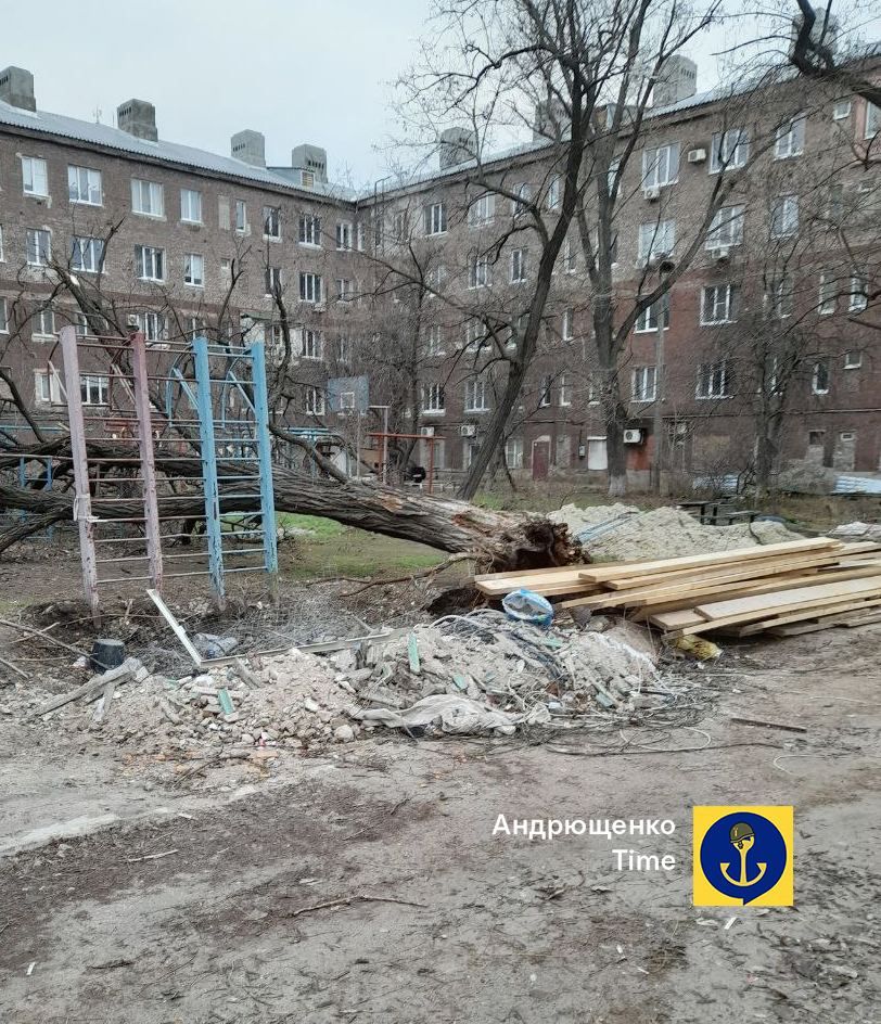 Штормовий вітер дійшов до окупованого Маріуполя. Через негоду у різних районах міста масові аварійні відключення, обірвані лінії електричних мереж, повалені дерева, профнастил, паркани, леєрні огорожі та баки для сміття,