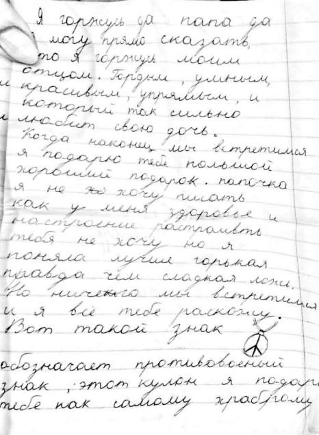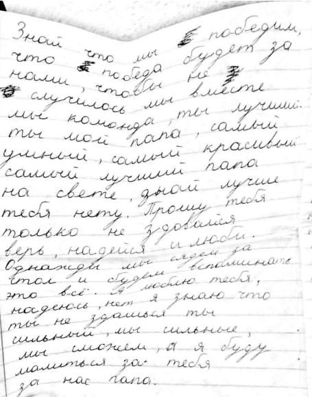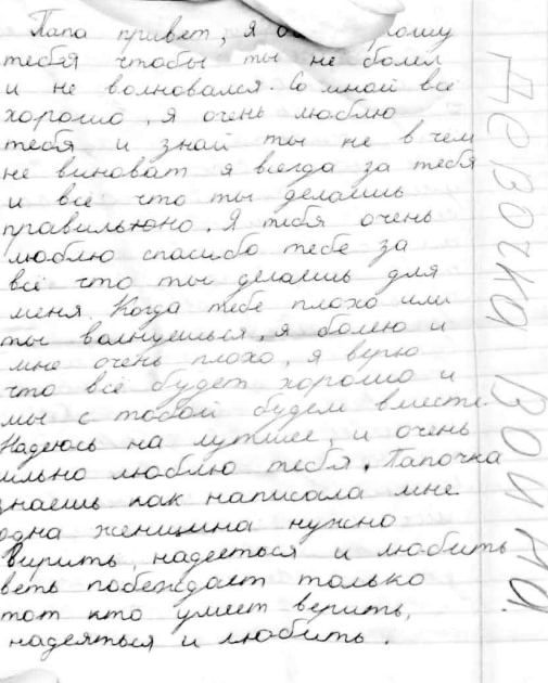 Знай, що ми переможемо, що перемога буде за нами, щоб не трапилося ми разом, ми команда, ти найкращий. Ти мій тато, найрозумніший, найкрасивіший, найкращий тато на світі. Знай – краще за тебе нема. Прошу тебе – тільки не здавайся. Вір, сподівайся і кохай,