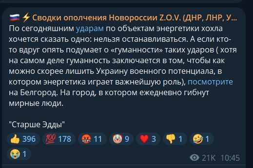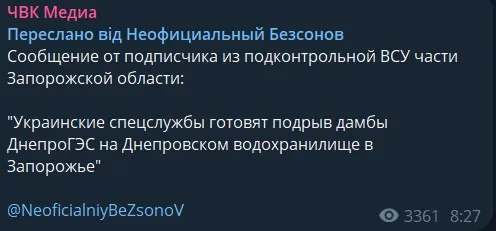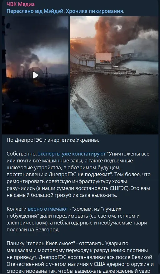 Ворог подає атаку на гідроелектростанцію як "помсту за Бєлгород". Деякі, розумніші пропагандисти, підчистили "попередження" Безсонова. Однак у більшості каналів досі є те повідомлення. Вони навіть не заморочуються щодо того, що вони суперечать самі собі.