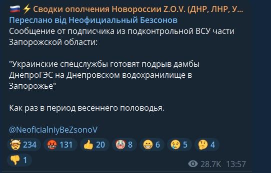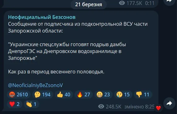 21 березня такий собі Даніїл Безсонов, якого росіяни зробили "першим заступником міністра інформації" у так званій "днр" опублікував повідомлення, в якому заявив, що Україна нібито "готується підірвати греблю ДніпроГЕС".