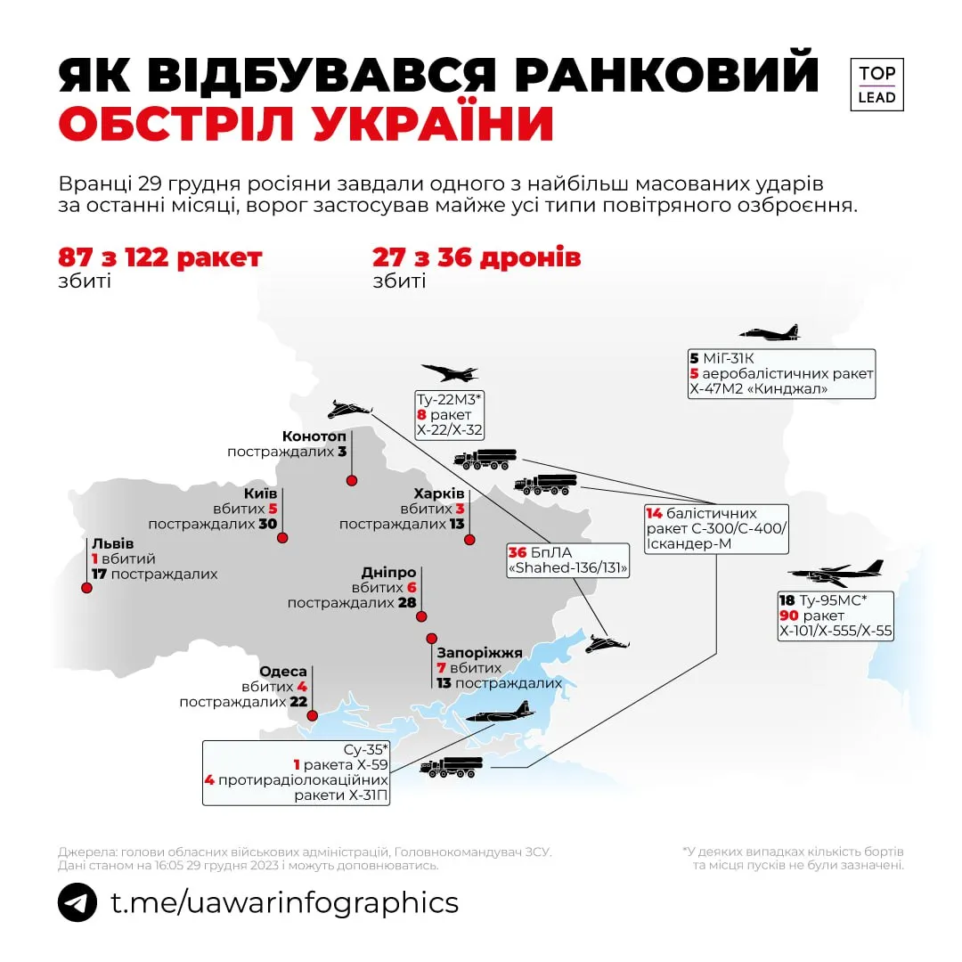 На жаль, всю п'ятницю, 29 грудня, з'являються нові повідомлення про загиблих. Окупанти били по багатьох українських містах.