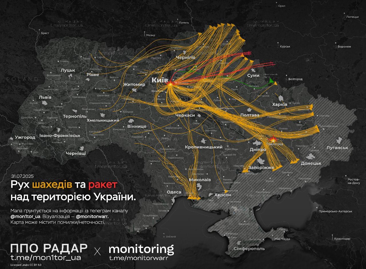 У ніч проти 31 липня ворог здійснив масовану комбіновану атаку по Україні, застосувавши велику кількість дронів та ракети. Російська зброя рухалася із Півночі та Сходу країни.