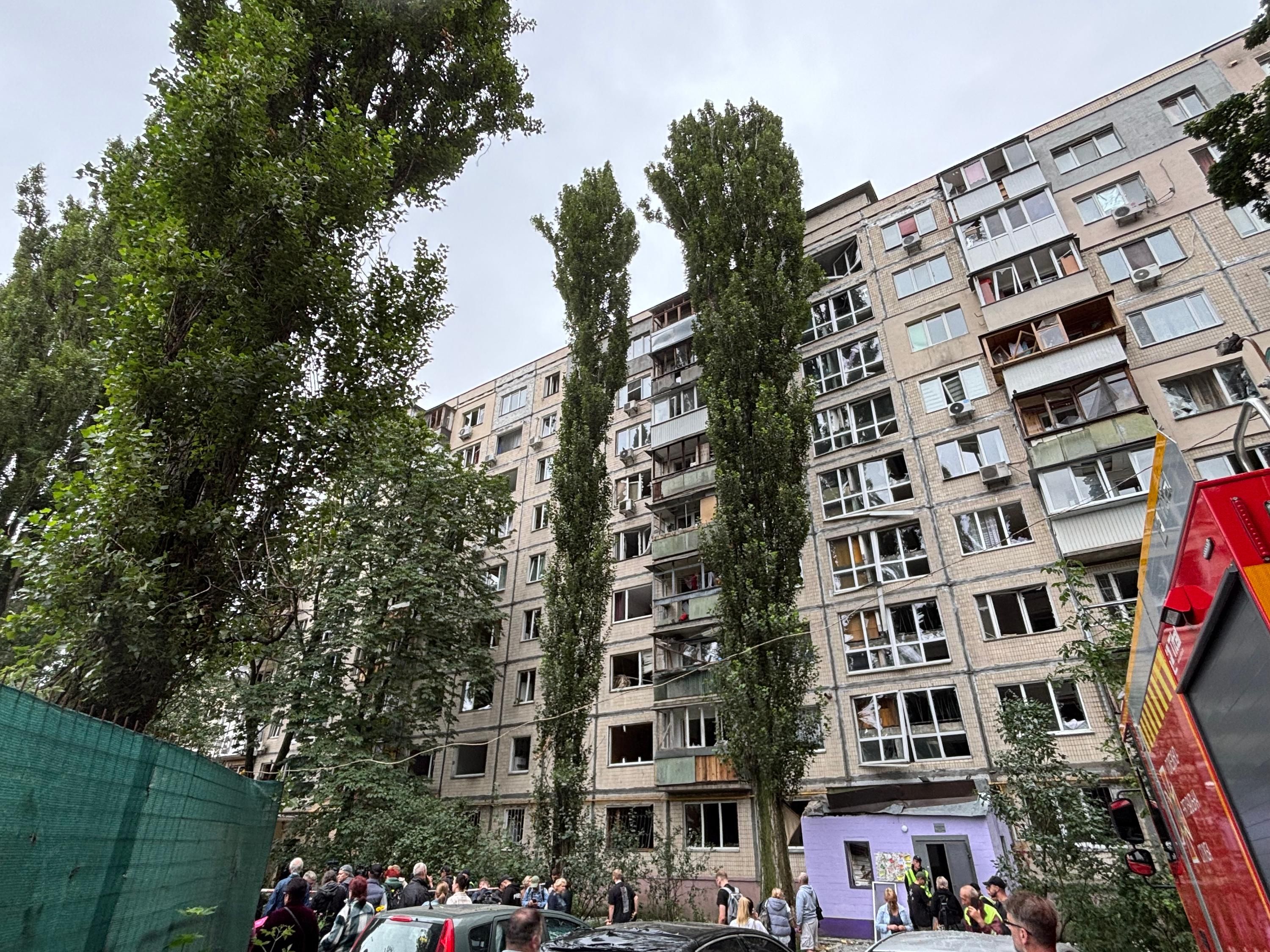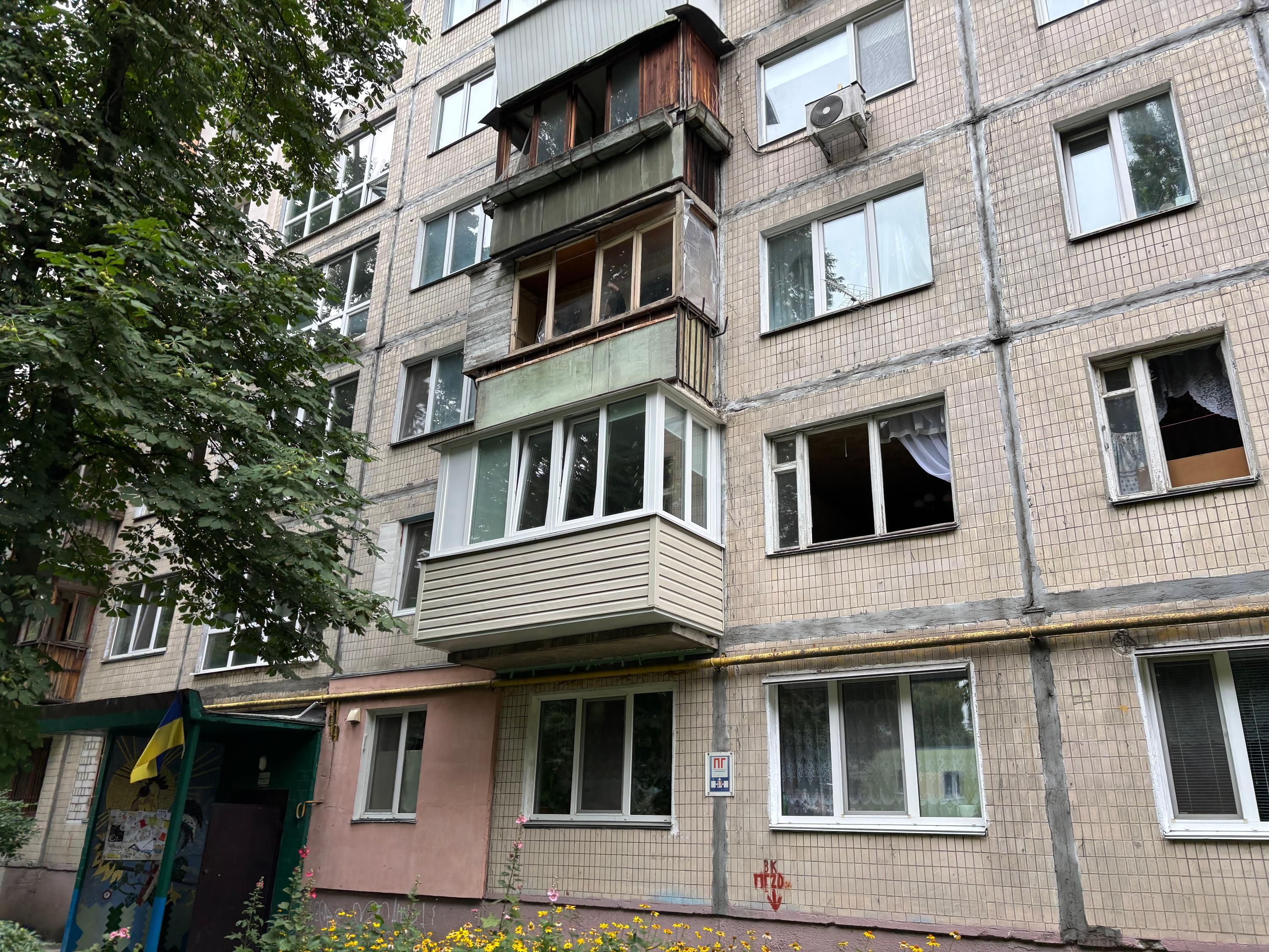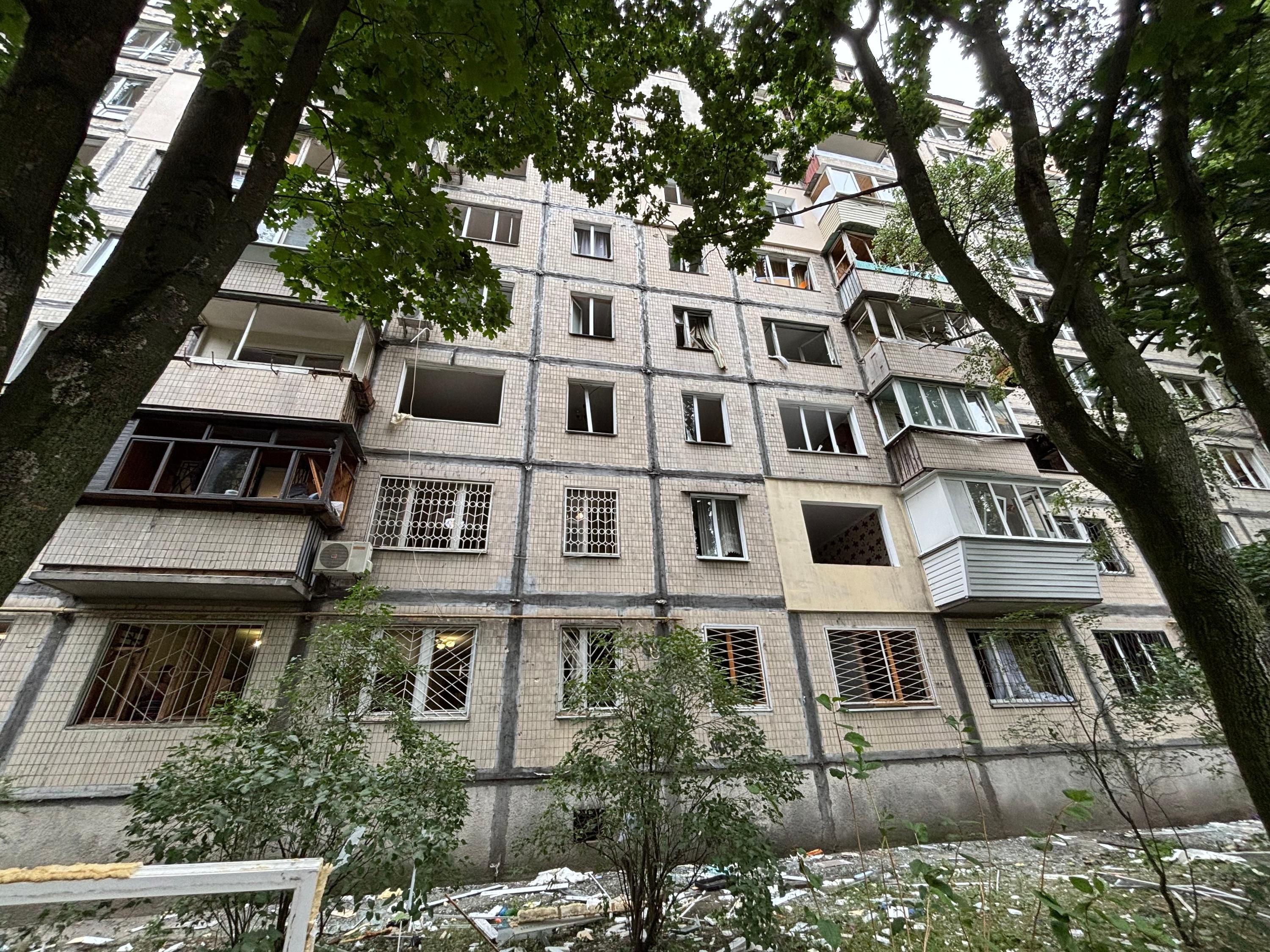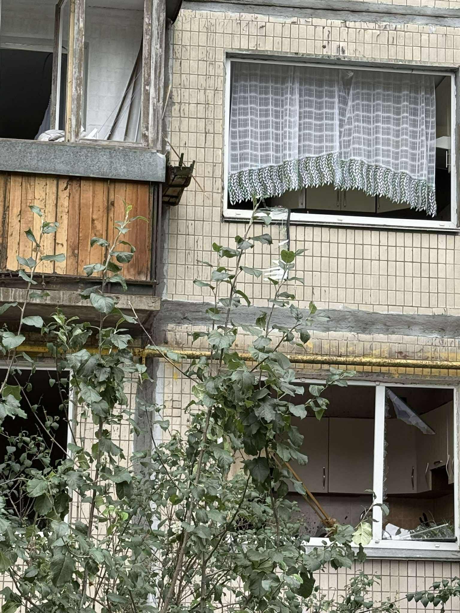За словами голови МВС Ігоря Клименка, влучання ракети в багатоквартирний будинок у Святошинському районі було прямим – у районі 5-го поверху. Траєкторію її падіння можна відстежити по обгорілому листю дерев.