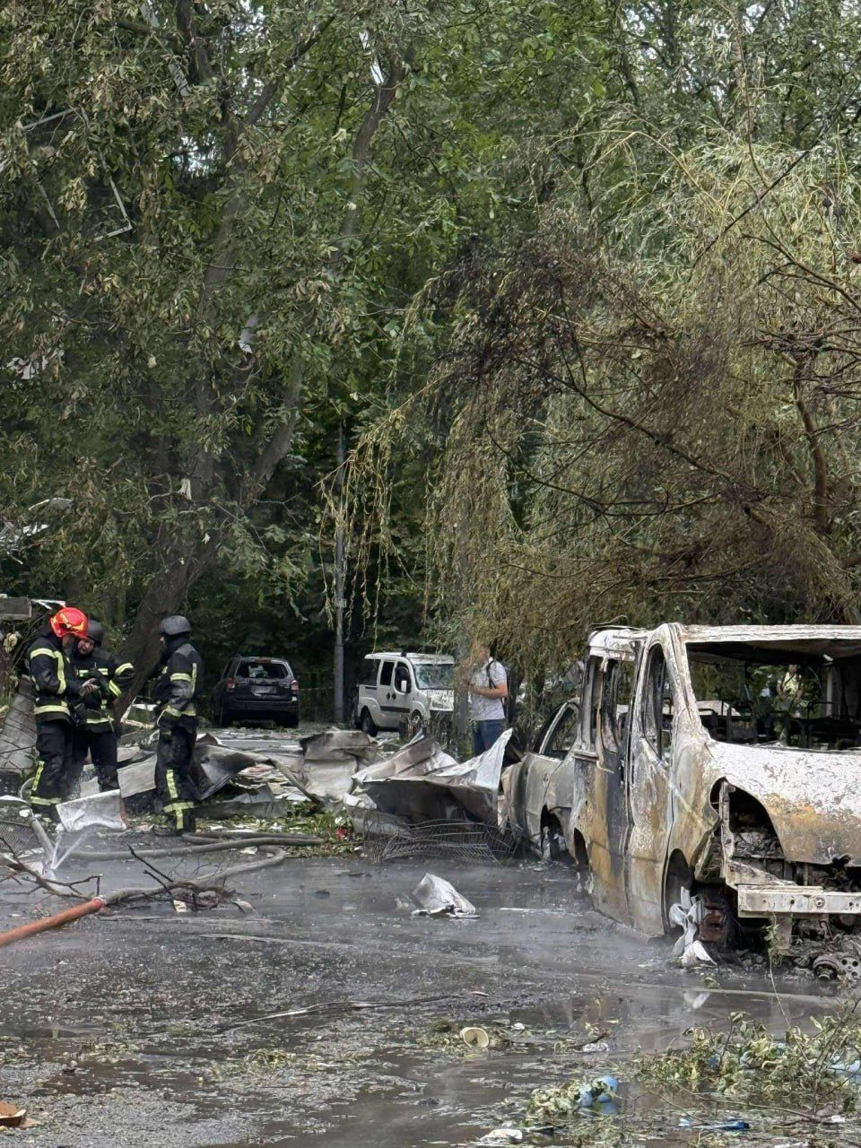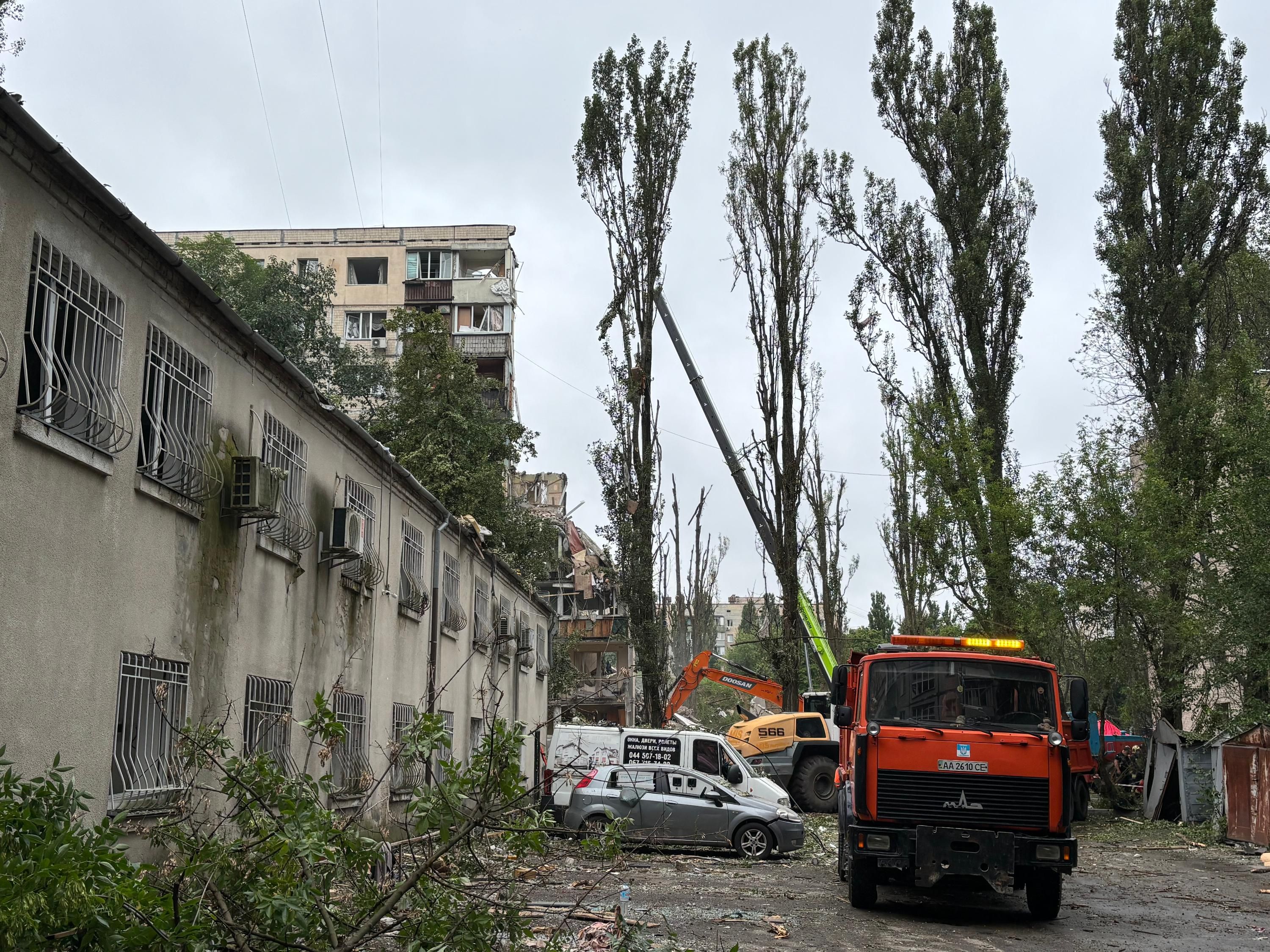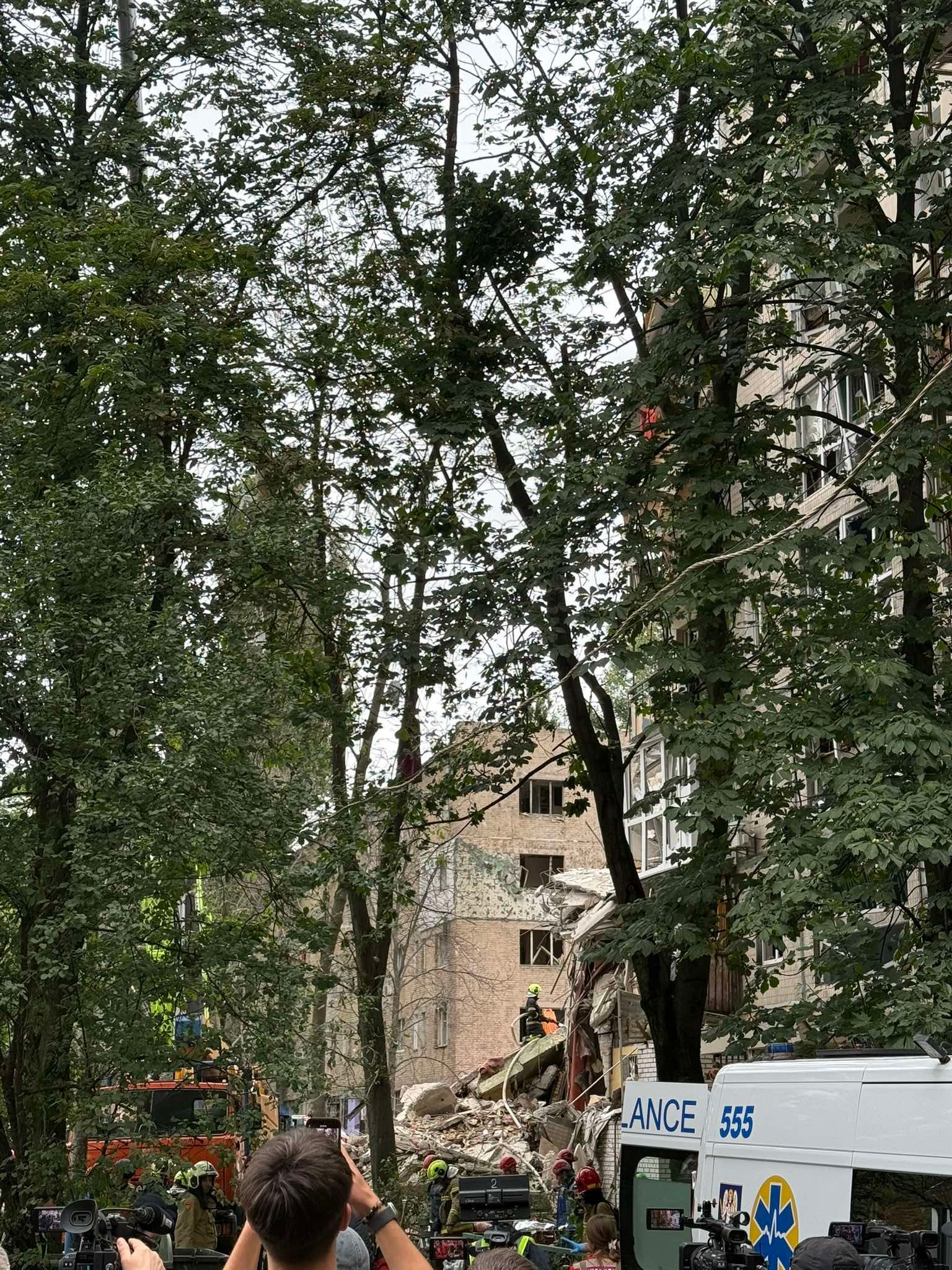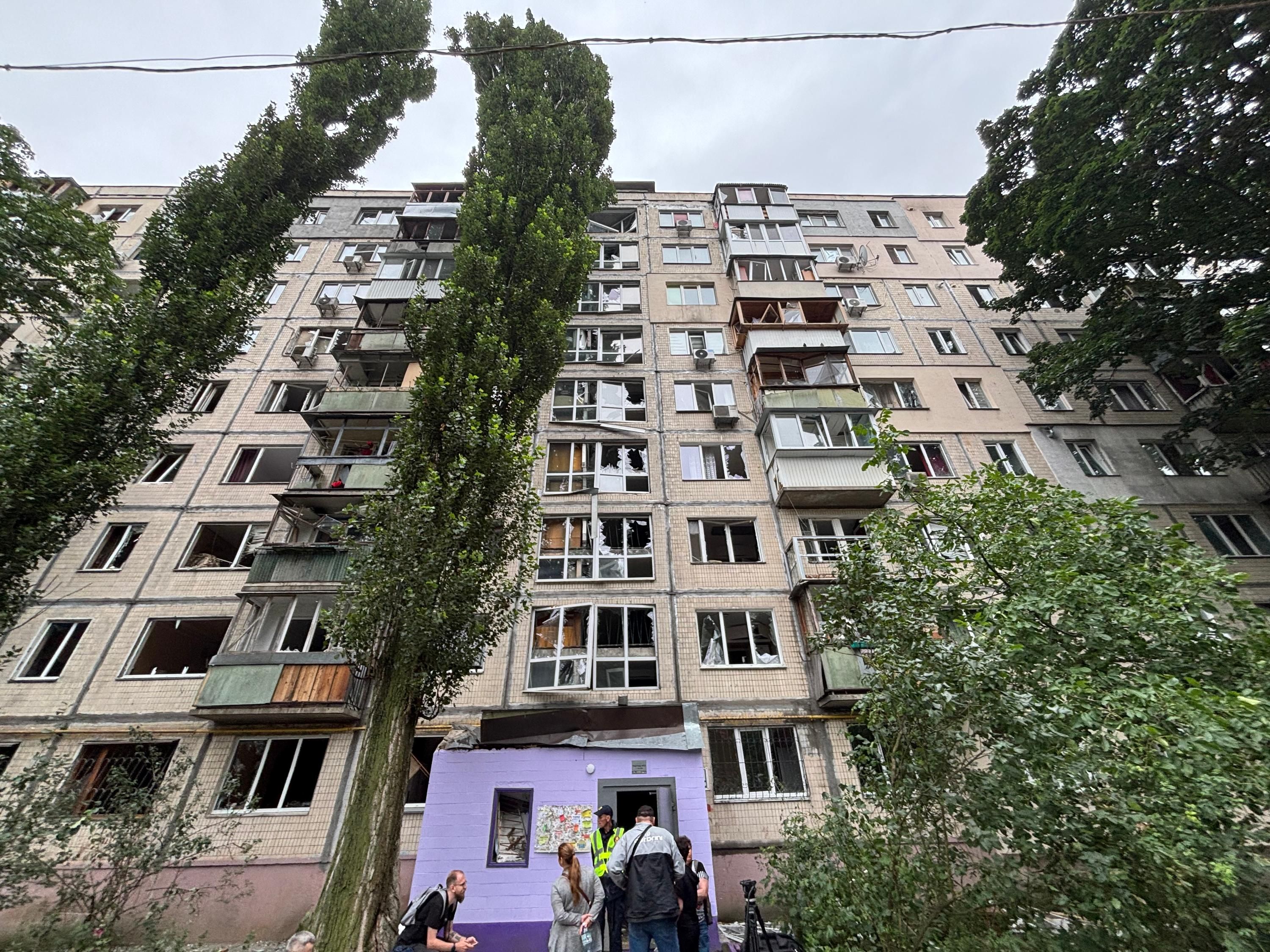 За словами голови МВС Ігоря Клименка, влучання ракети в багатоквартирний будинок у Святошинському районі було прямим – у районі 5-го поверху. Траєкторію її падіння можна відстежити по обгорілому листю дерев.