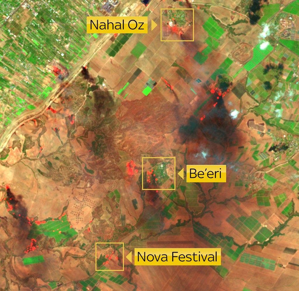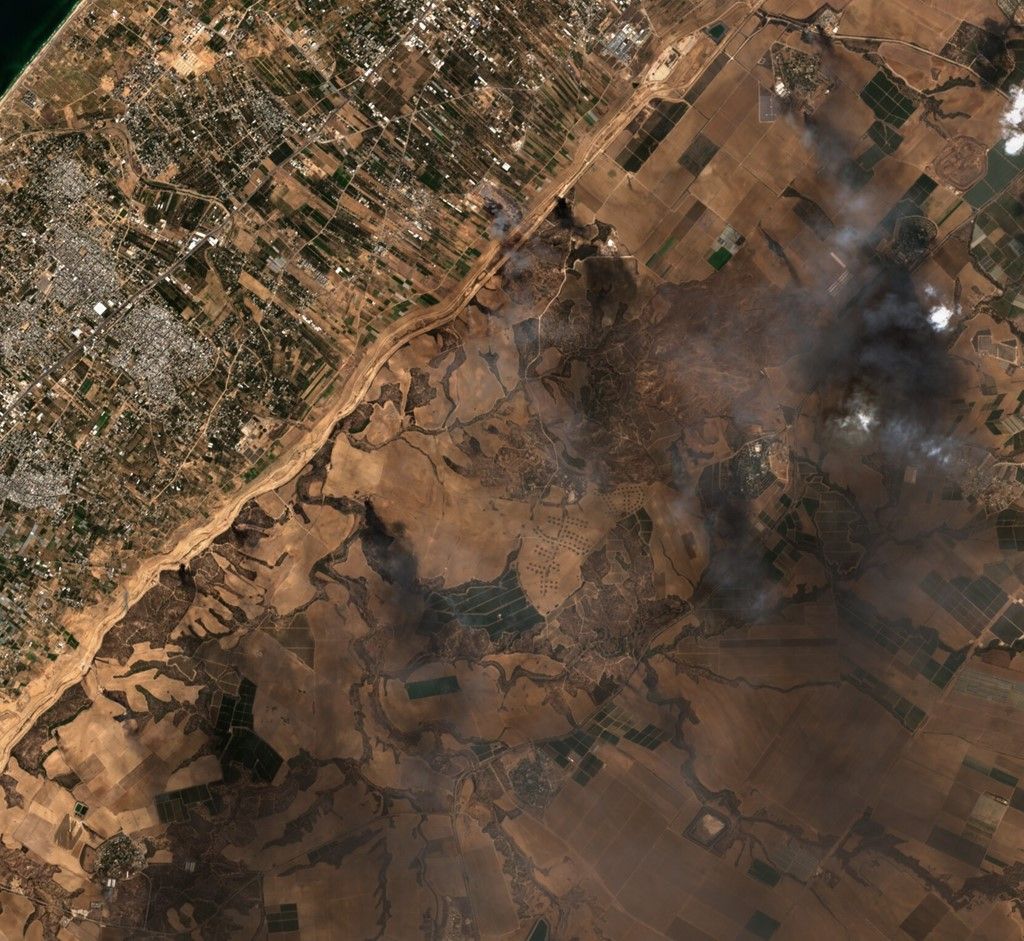 На одному зі знімків зображено територію на кордоні Сектора Гази та Ізраїлю. Там вранці 7 жовтня сталися сотні пожеж. Дим підіймався над поселеннями, а також над місцем, де відбувався музичний фестиваль Supernova – там загинуло щонайменше 260 людей.