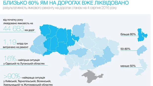 Загалом, станом на 11 серпня в Україні ліквідовано близько 60% ям на дорогах – це понад 44 тис км доріг.