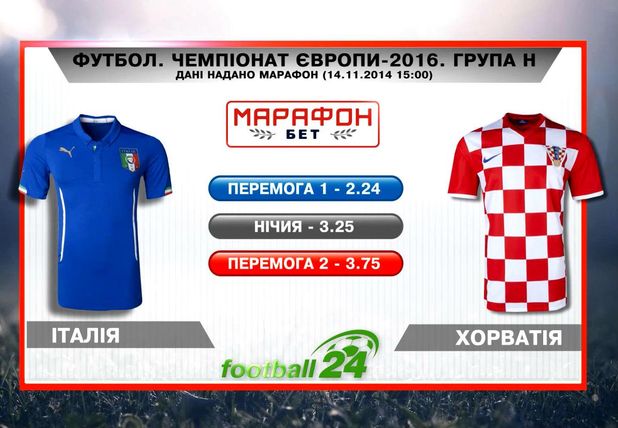 Попри це, фаворитом протистояння фахівці вважають господарів матчу – команду Італії. Коефіцієнт на перемогу "Сквадри Адзури" – 2,24. Тоді як тріумф картатої збірної оцінений балом 3,75 сотих. За версією сайту Football24.ua мінімальну перемогу оформлять хлопці Антоніо Конте.