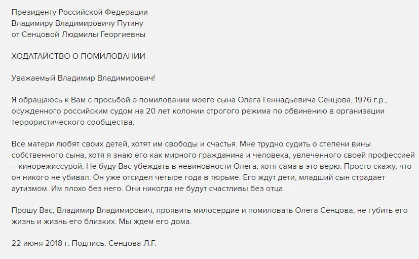 "Усі матері люблять своїх дітей, хочуть їм свободи і щастя. Мені важко судити про ступінь провини власного сина, хоча я знаю його як мирного громадянина та людини, захопленої своєю професією – кінорежисурою. Не буду Вас переконувати в невинності Олега, хоча сама в це вірю. Просто скажу, що він нікого не вбивав. Він уже відсидів чотири роки у в'язниці. Його чекають діти, молодший син страждає аутизмом. Їм погано без нього. Вони ніколи не будуть щасливі без батька", – йдеться у документі.