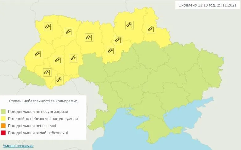 За інформацією Укргідрометцентру, сильний вітер не припинить дути й 30 листопада. У західних та північних областях він розганятиметься до 15 – 20 метрів за секунду. Через це там оголосили I рівень небезпечності – жовтий.