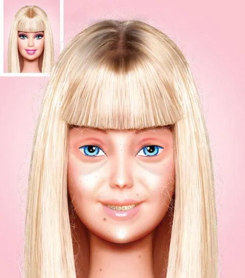 "Безмакіяжна" Барбі на малюнку Агірре має кола під очима, носить брекети, її шкіра - з жирним блиском, на обличчі є родимки.