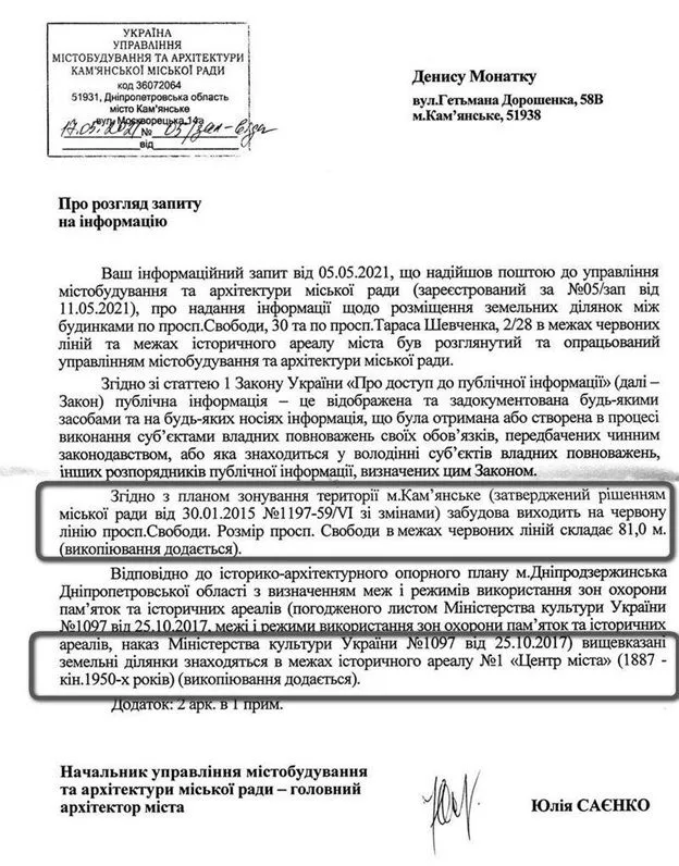 Це твердження оскаржила головний архітектор Кам'янського Юлія Саєнко, яка у своїй офіційній відповіді повідомила, що ділянки, на яких йде будівництво МАФів, знаходяться в межах так званого історичного ареалу міста №1, а значить забудова за правилами благоустрою Кам'янського заборонена.
