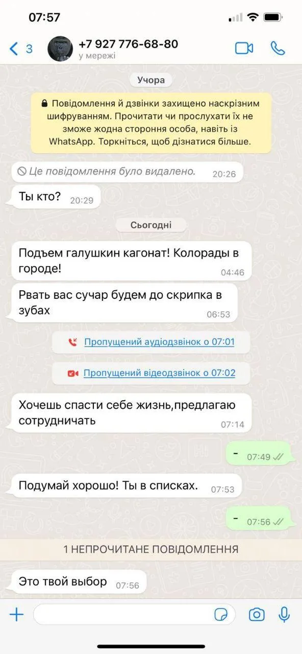 З російського номера мені знову надійшли погрози та пропозиції про співпрацю. І, звісно, в черговий раз ворог отримав категоричну відмову,