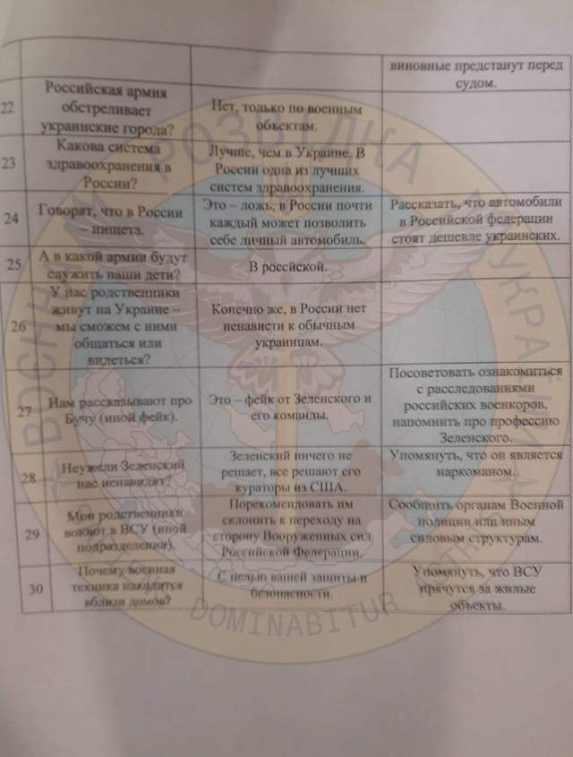 Також документ містить таблицю з питаннями, які найчастіше ставить українське населення окупантам і типовими відповідями з додатковими роз'ясненнями: