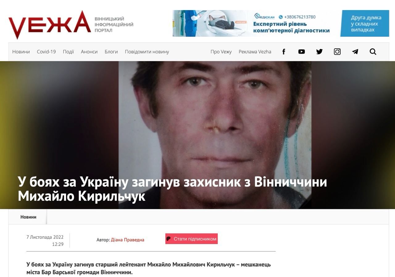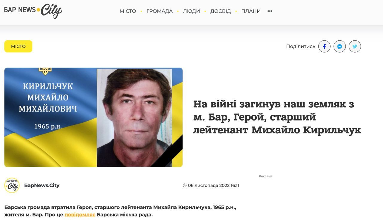 "На війні загинув наш земляк, старший лейтенант Михайло Кирильчук", – саме з такими заголовками на початку листопада 2022 року ЗМІ поширили цю сумну звістку з посиланням на Барську міську раду. Знайти першоджерело цього повідомлення уже неможливо – його видалили. Але, щонайголовніше, загинув боєць у Львові. За обставин, які дивують, і що дивує ще більше – обставин, які досі не змогли остаточно встановити правоохоронні органи.