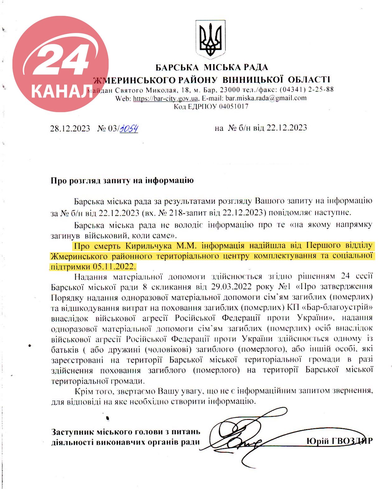 Повідомлення Барської міської ради та ЗМІ про смерть Кирильчука / 24 Канал
