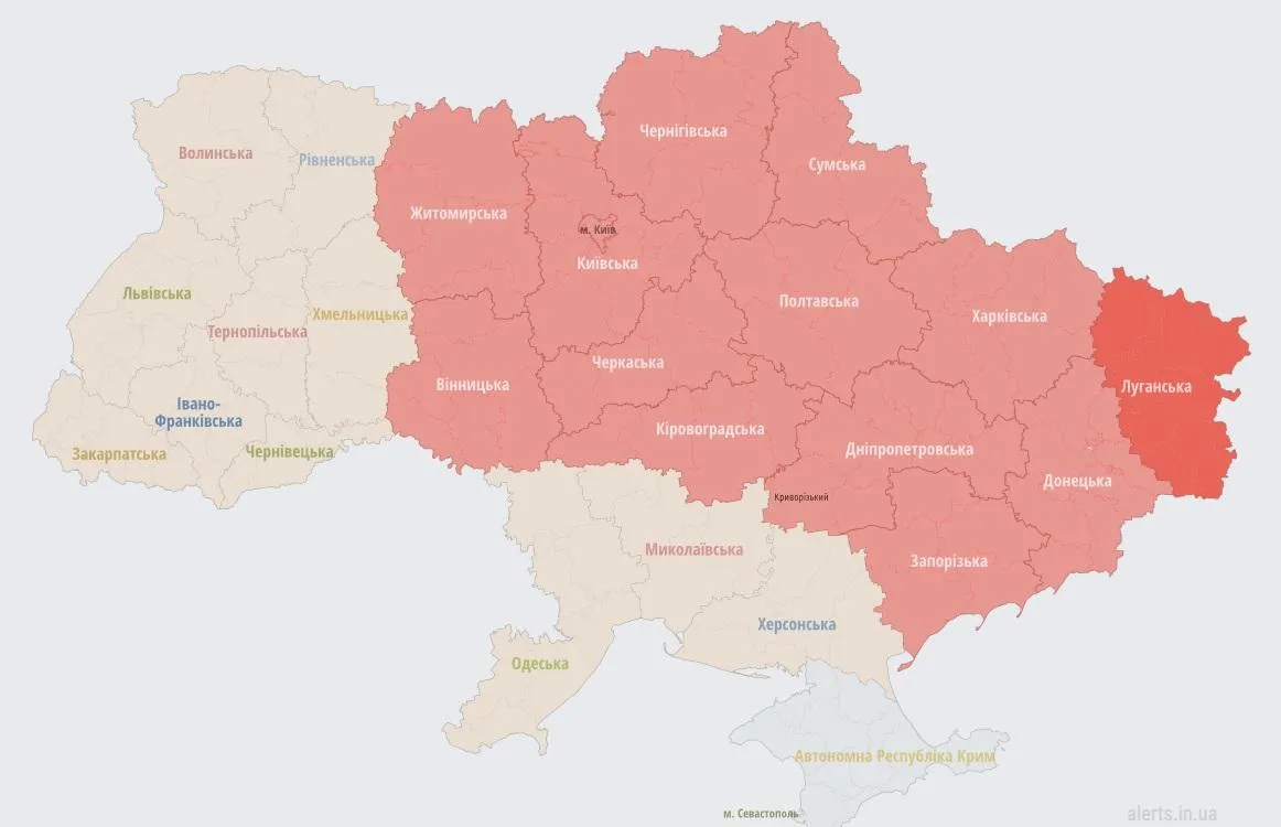 Станом на 16:50 загроза авіаудару оголошена у всіх областях України, окрім Заходу та Півдня. Повітряна тривога у: