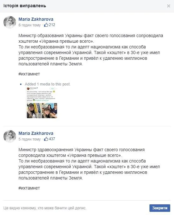"Міністр освіти України факт свого голосування супроводила хештегом "Україна понад усе". Чи то неосвічена, чи адепт націоналізму як способу управління сучасної України. Такий "хештег" в 30-ті вже мав поширення в Німеччині й призвів до видалення мільйонів користувачів планети Земля", – написала Захарова.