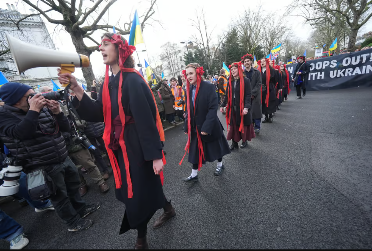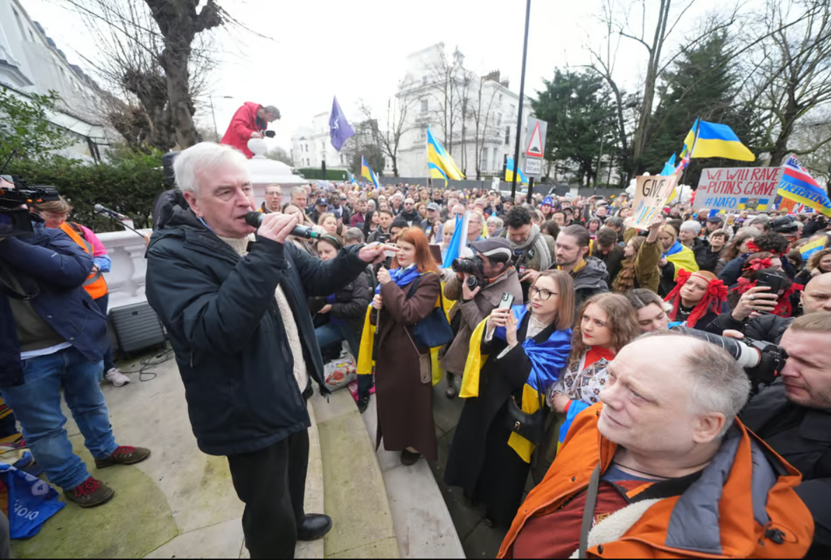 Коаліція українських громадських і британських трудових організацій взяла участь у мітингу. Вони закликали Росію вивести війська напередодні 3-ої річниці повномасштабного вторгнення в Україну.