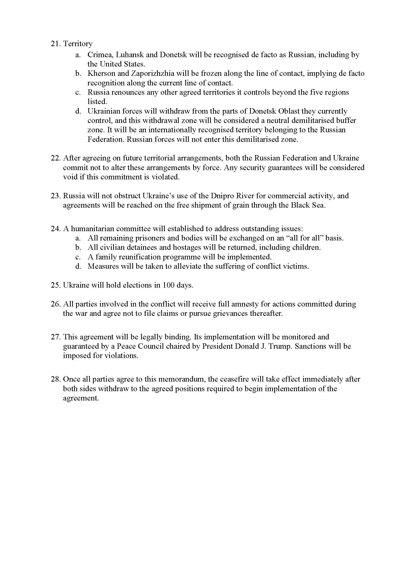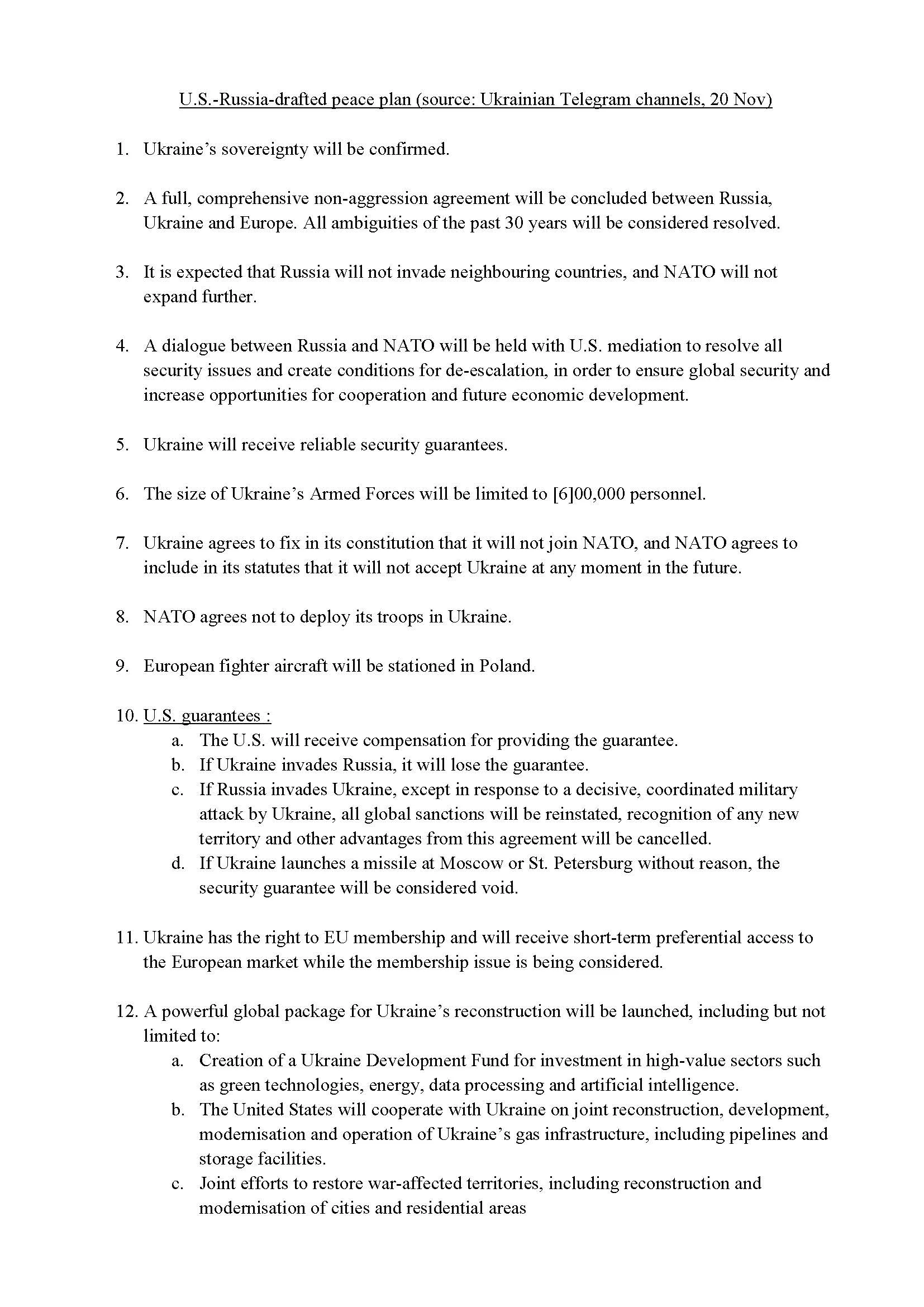 Пропозиція під назвою "Мирний план, розроблений США та Росією" підтвердить суверенітет України, але обмежить чисельність Збройних Сил до 600 000 осіб та заборонить країні вступити до НАТО назавжди.