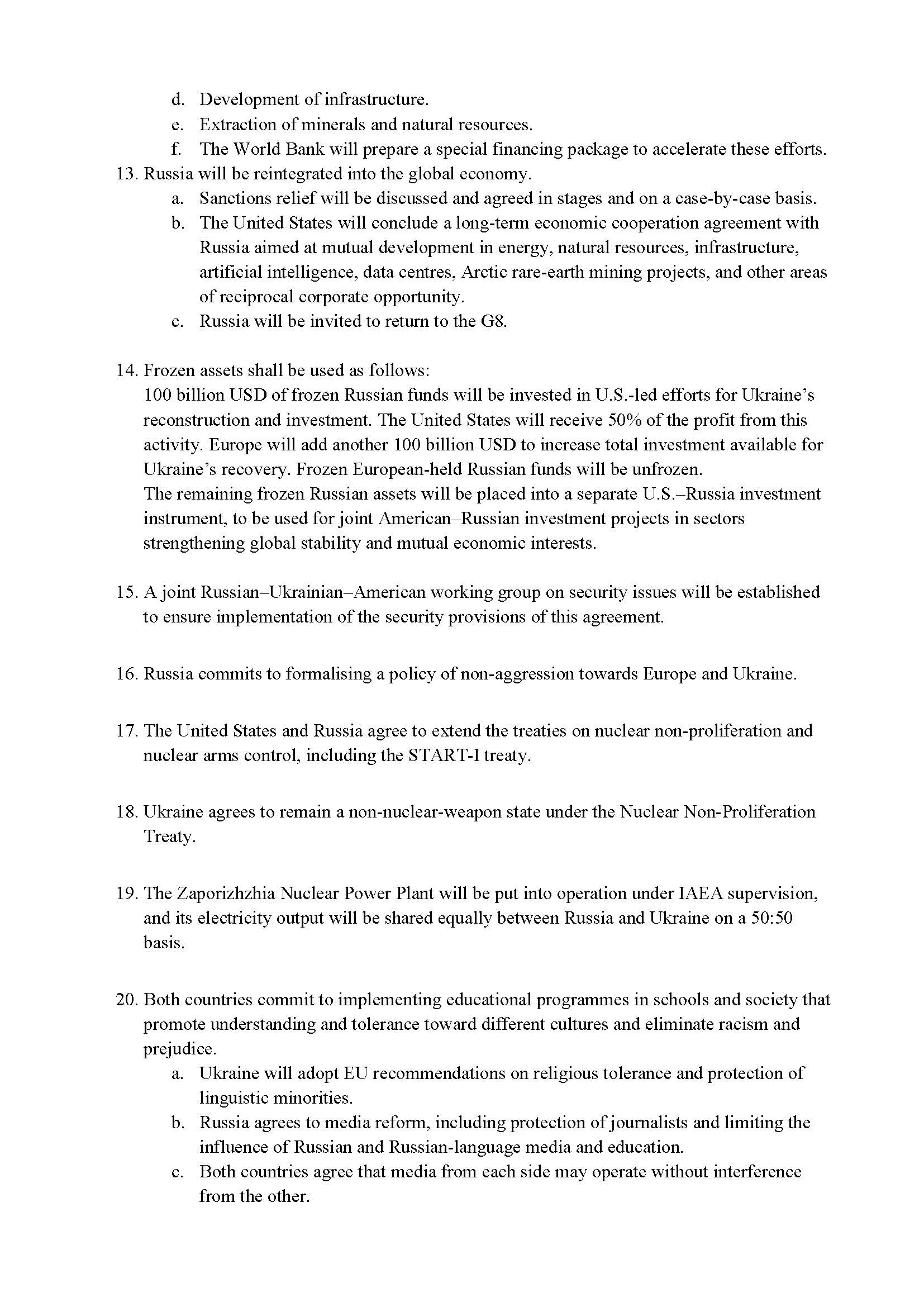 В обмін Росія зобов'язується не здійснювати нових нападів і отримає можливість повернення до глобальної економіки, включно з потенційним пом'якшенням санкцій, яке розглядатиметься "у кожному випадку окремо". Також країна-агресорка зможе повернутися до "Групи семи" – до 2014 року це була "Група восьми", звідки Росію виключили після незаконної анексії Криму та початку війни на Сході України.
