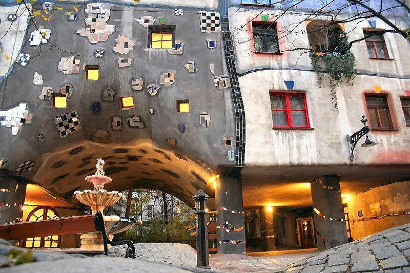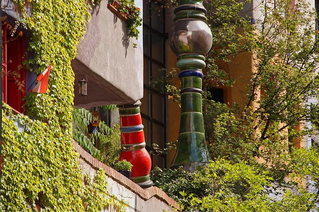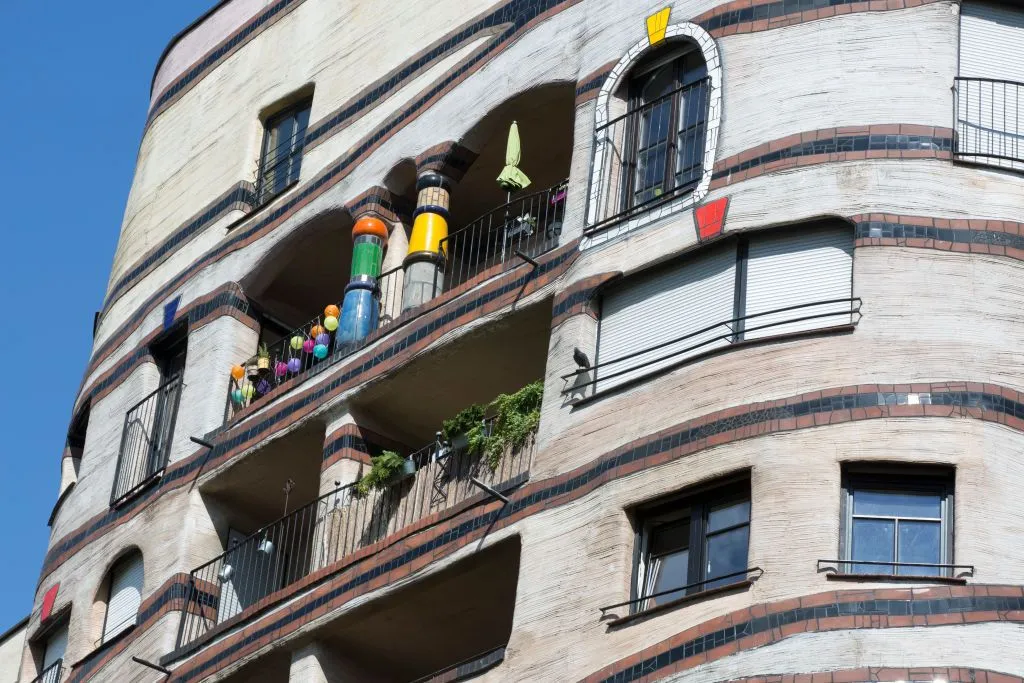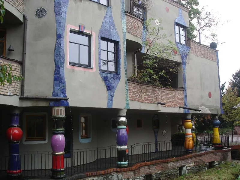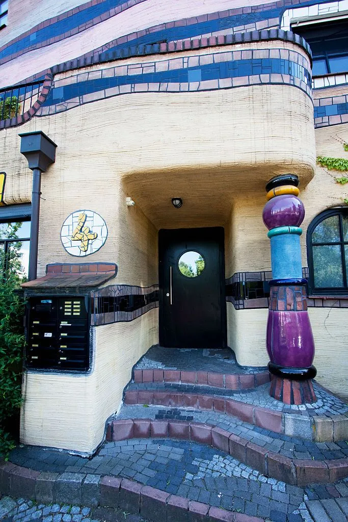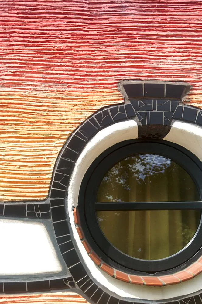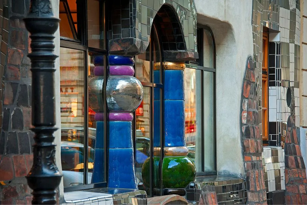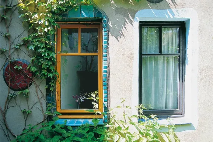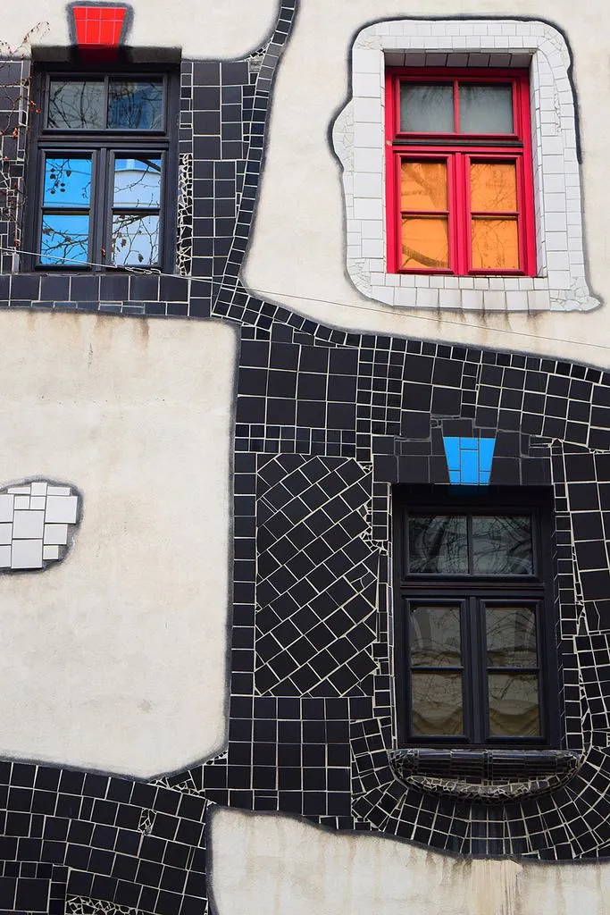 Соковиті будівлі виблискують кольорами, битою керамічною плиткою і підморгують численними вигадливими вікнами. До слова, саме вікна були для Хундетвассера основою будівлі.