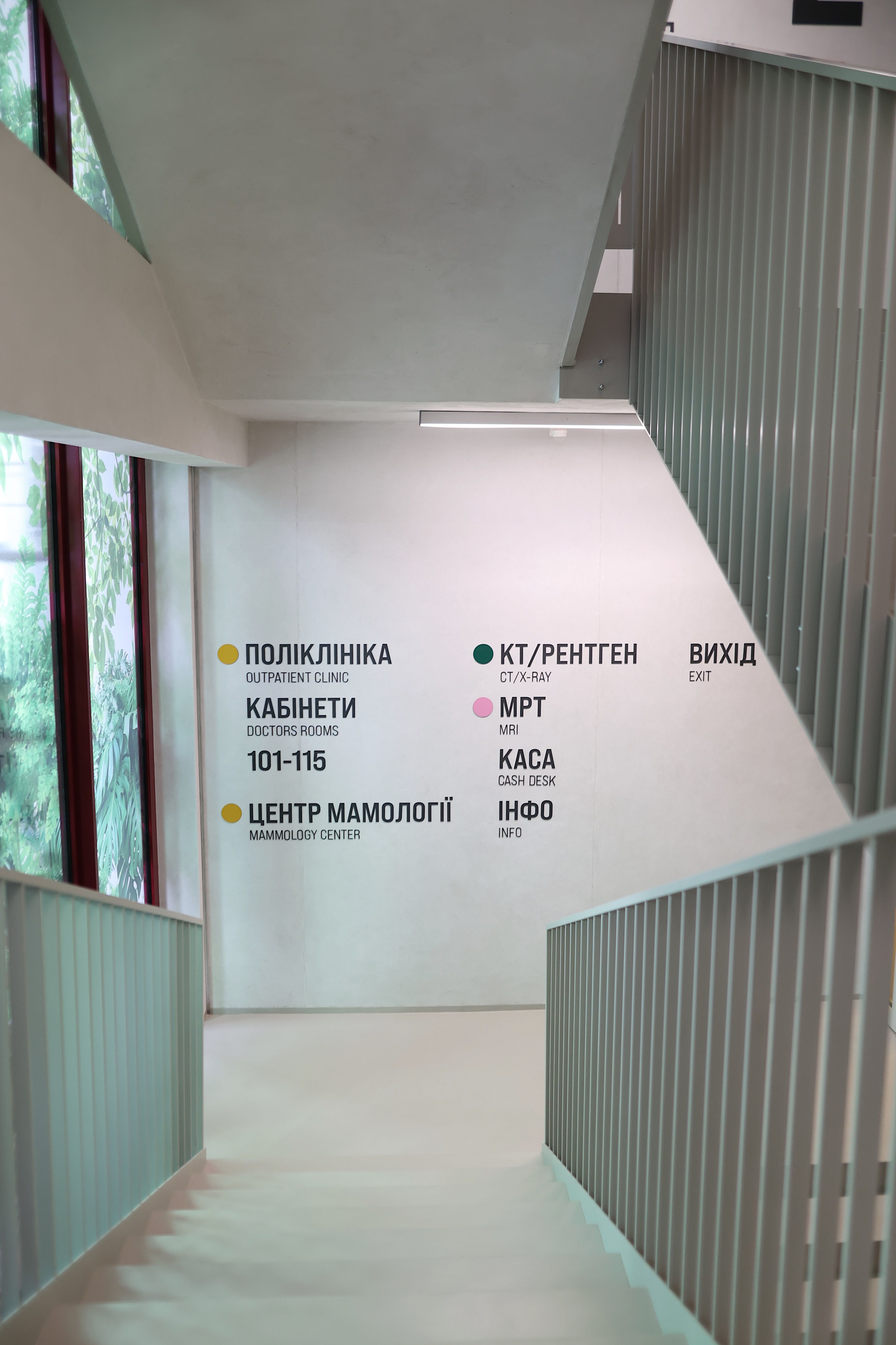 Усі відділення проєктувалися, як окремі зони. При цьому команда архітекторів та дизайнерів опиралася на досвід лікарів та зробила все можливе, щоб відтворити шлях пацієнта, який проходить лікування в стінах медзакладу. Таким чином, навіть при першому візиті, все сприймається максимально інтуїтивно. А додаткові вказівники лише підсилюють ефект турботливого супроводу поверхами, яких, до речі, тут чотири.