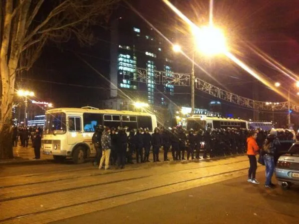 Видання "Новости Донбасса" повідомляє, що б'ються близько 400 осіб. Сутичку, згідно з повідомленням, спровокували проросійські активісти.