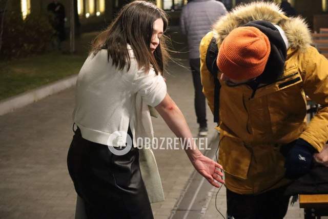На деяких кадрах видно, як під час штовханини з охороною Володимира Зеленського, журналістка опиняється спочатку на автомобілі, а потім на землі. Виявилось, що постраждала співробітниця телеканалу "Прямий" Ганна Дзьоба. Очевидно, вона впала на лікоть, адже згодом опублікували фото, на яких видно кров через забій руки.