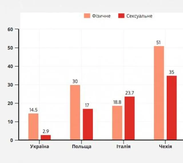Показник насилля над українками — один із найнижчих у Європі. Проте, в Україні 43% жінок хоча б раз у житті зіштовхувалися зі спробами сексуального насилля і 20% жінок зазнавали фізичного насилля з боку свого партнера. Та соціологи стверджують, що ці дані дуже занижені.