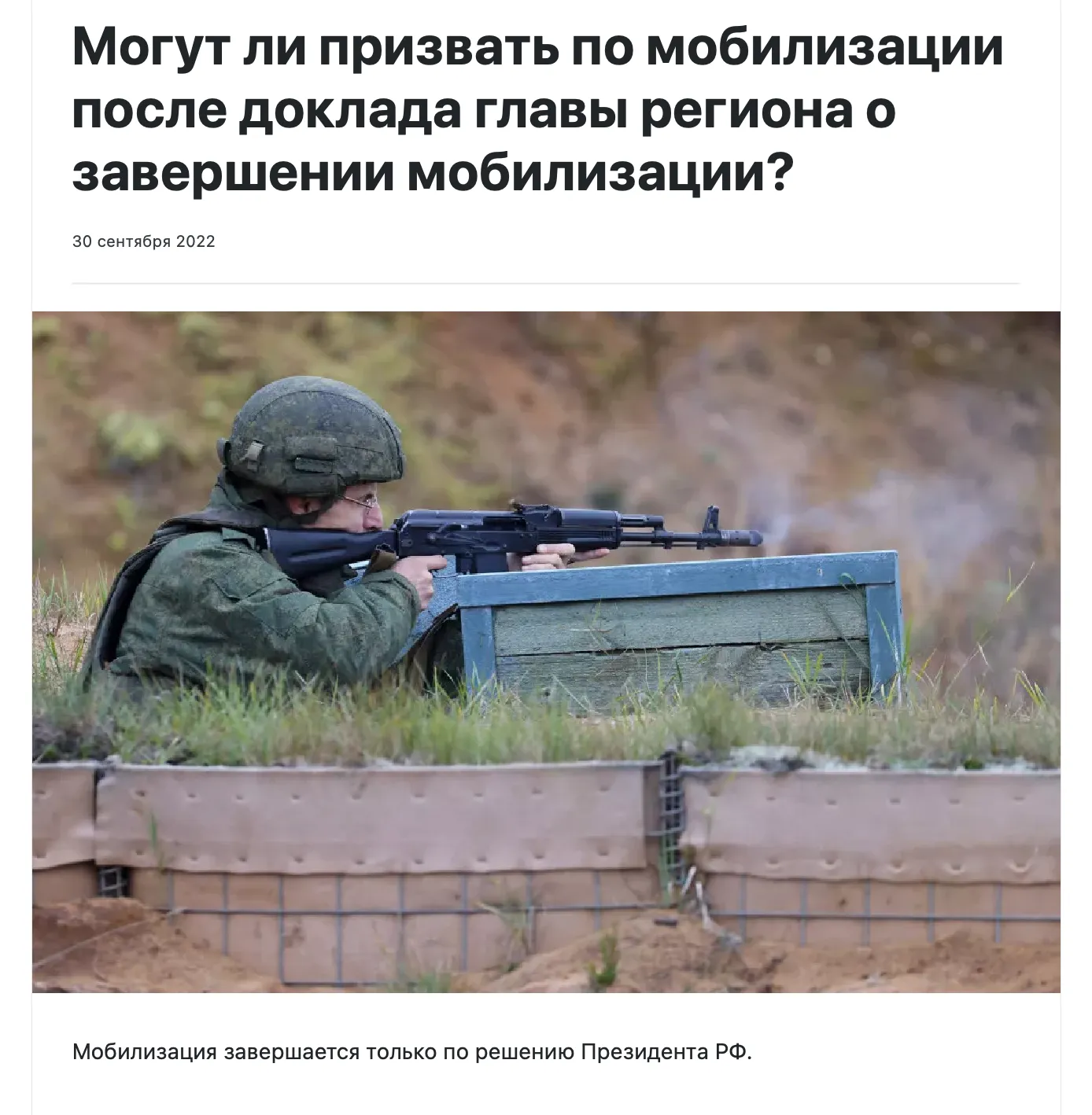 Тепер же з'явилася інформація, що часткова мобілізація, як її не називай, не має конкретних термінів. Ба більше, завершиться вона лише указом президента Росії Владіміра Путіна. Про це йдеться на урядовому порталі "Пояснюємо. Росія". Крім нього, такими повноваженнями не володіє ніхто.