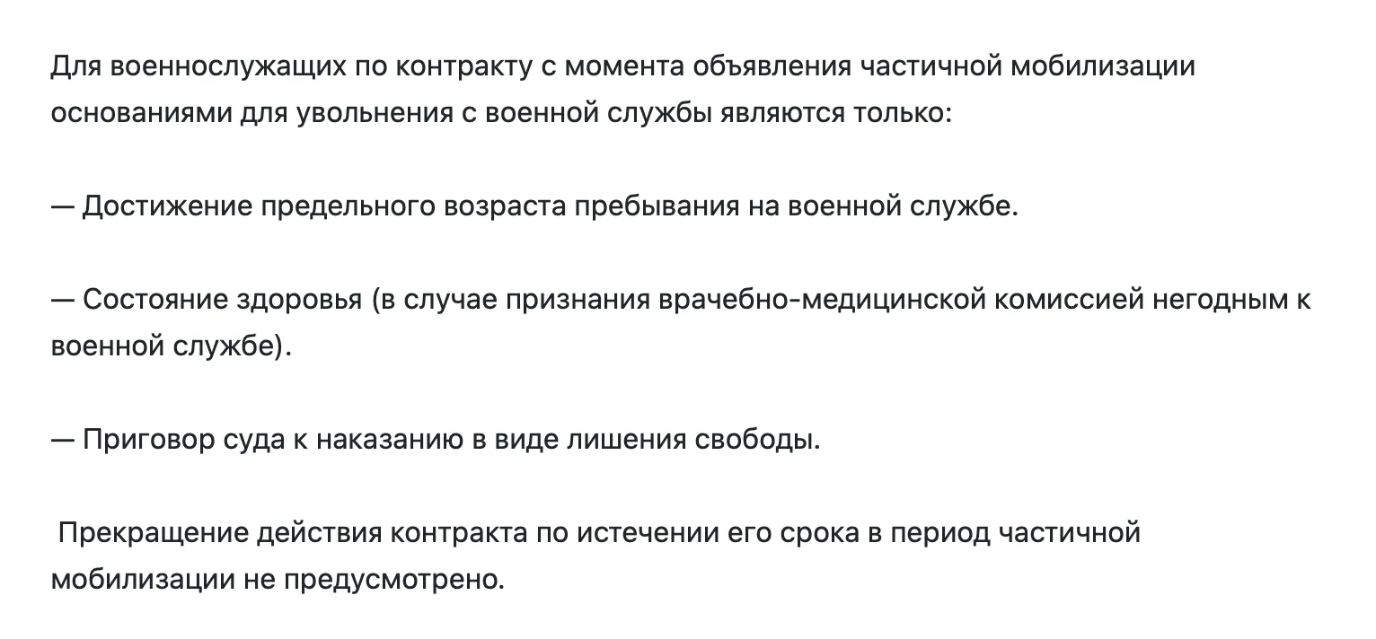 Кілька винятків, за яких можуть звільнити від служби, – досягнення граничного віку служби, проблеми зі здоров'ям, вирок суду, у якому йдеться про позбавлення волі. Останній пункт цікавий, якщо враховувати, що на війну росіяни відправляють злочинців безпосередньо з в'язниць.