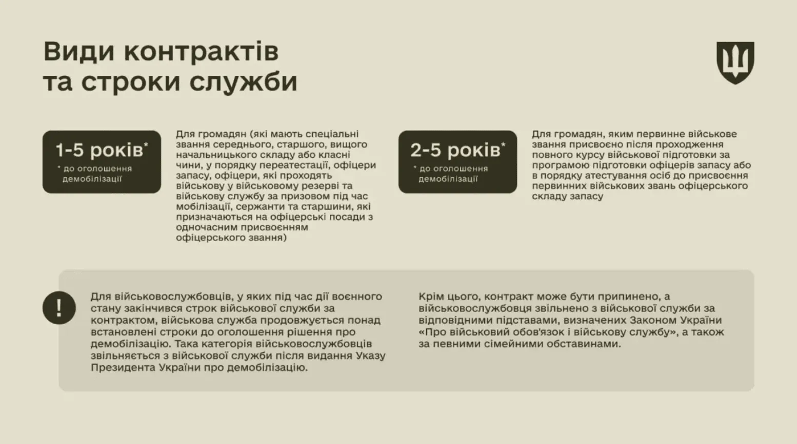 На проходження військової служби контракт можуть підписати як громадянки України, так і іноземці або особи без громадянства віком від 18 років. для осіб, які приймаються на військову службу за контрактом, строк військової служби встановлюється на час до оголошення рішення про демобілізацію.
