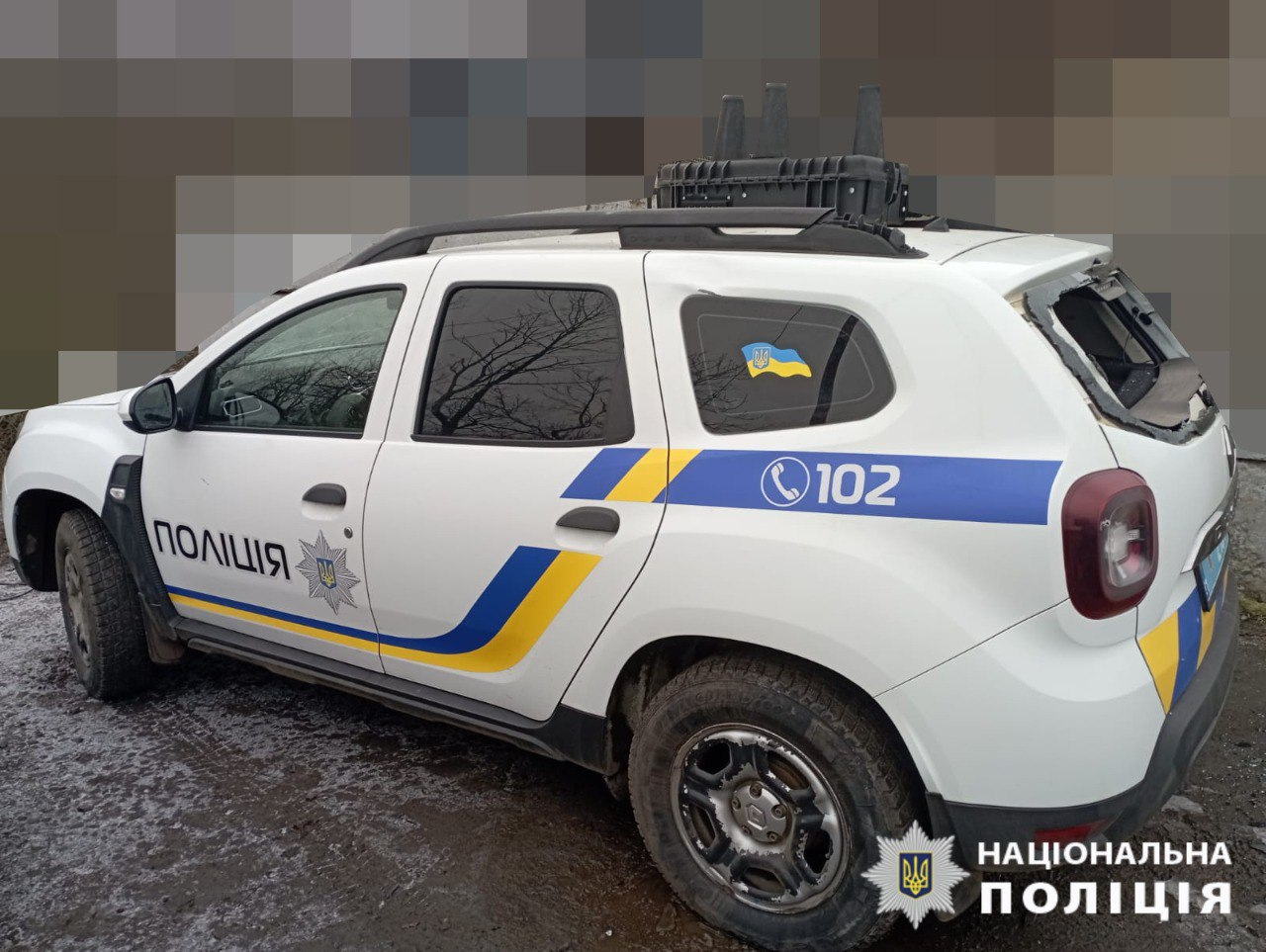 Поліцейський автомобіль отримав пошкодження, зокрема вибито заднє вікно.