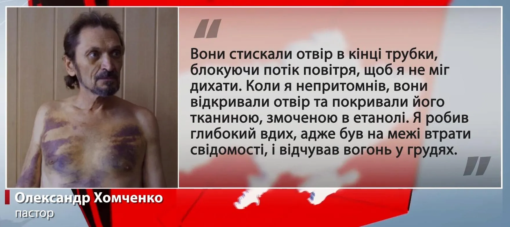 А пастора Сергія Косяка жорстокого побили за проукраїнську позицію. У підтримці української армії звинуватили і Олександра Хомченка. Його чотири дні катували, надягнули на голову протигаз і перекрили повітря.