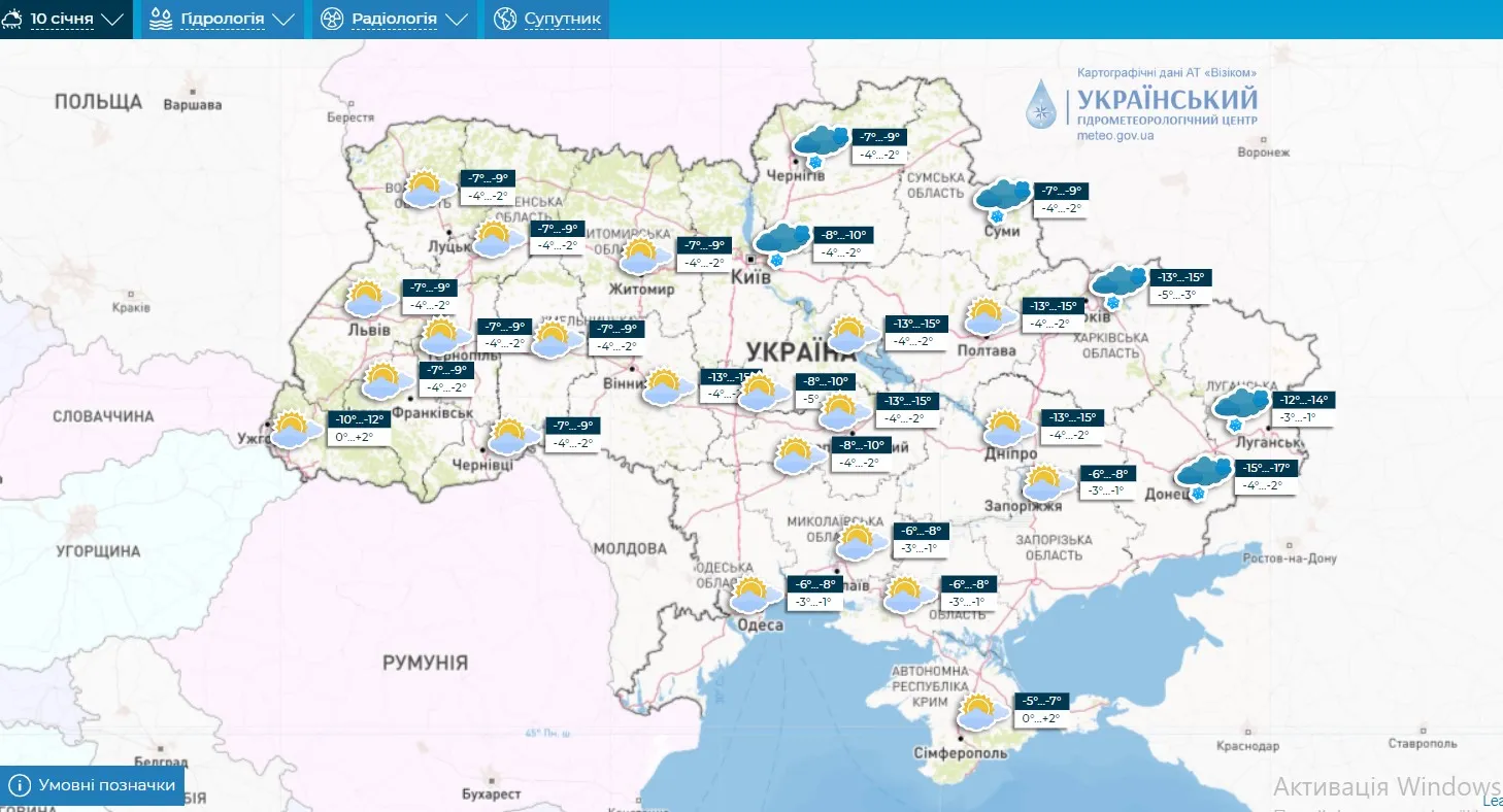 Прогноз погоди на 10 січня / Скриншот сайту Укргідрометцентр