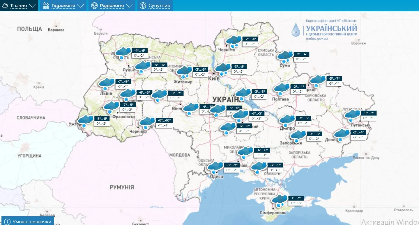 Прогноз погоди на 11 січня / Скриншот з сайту Укргідрометцентру