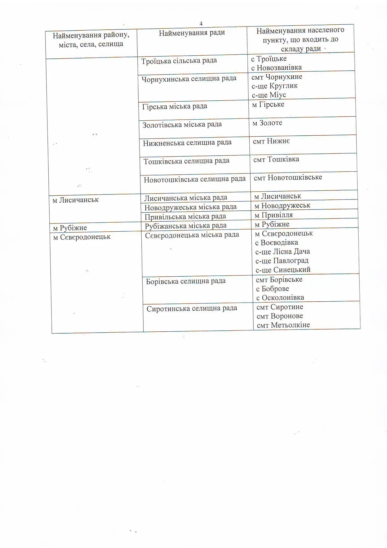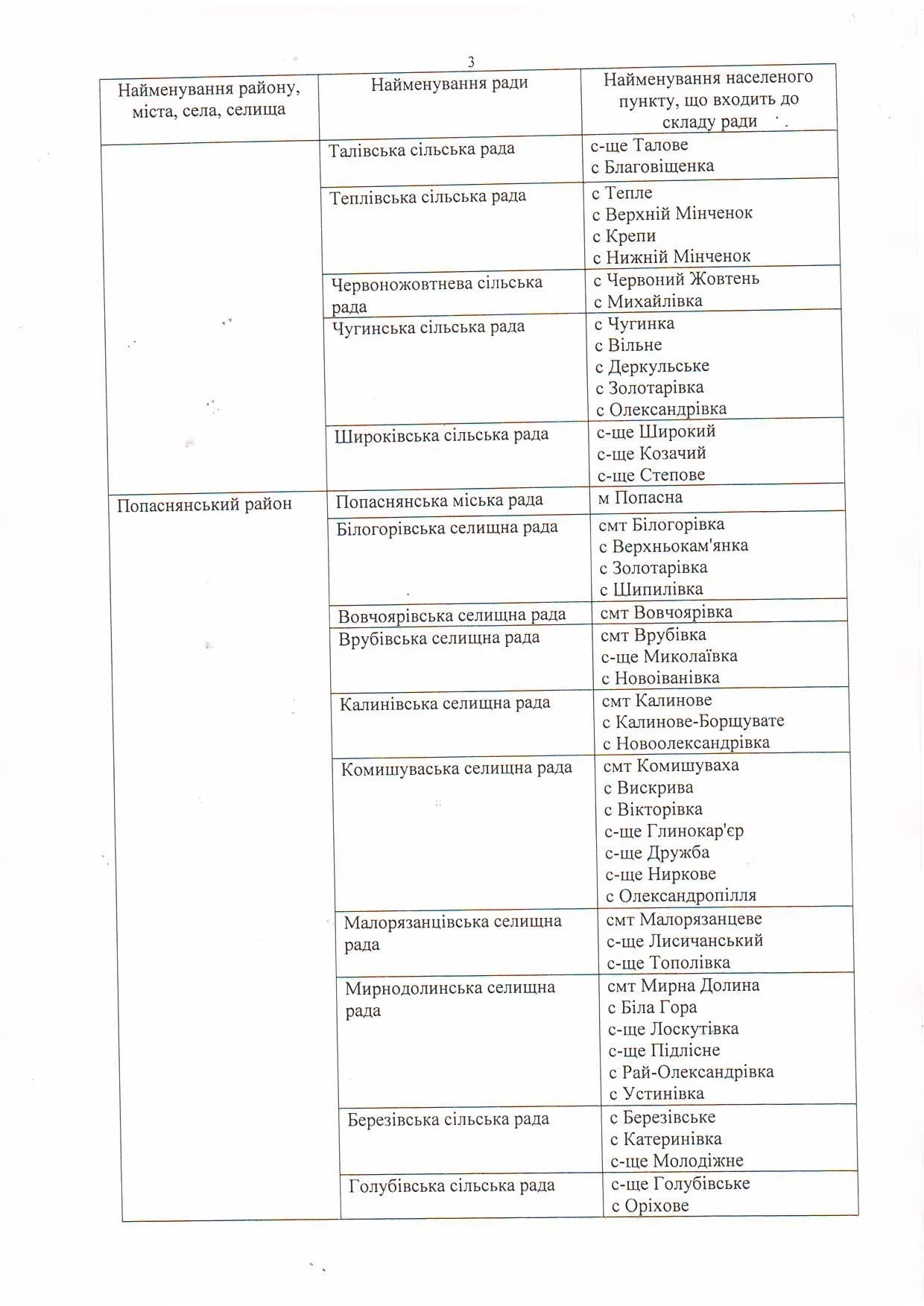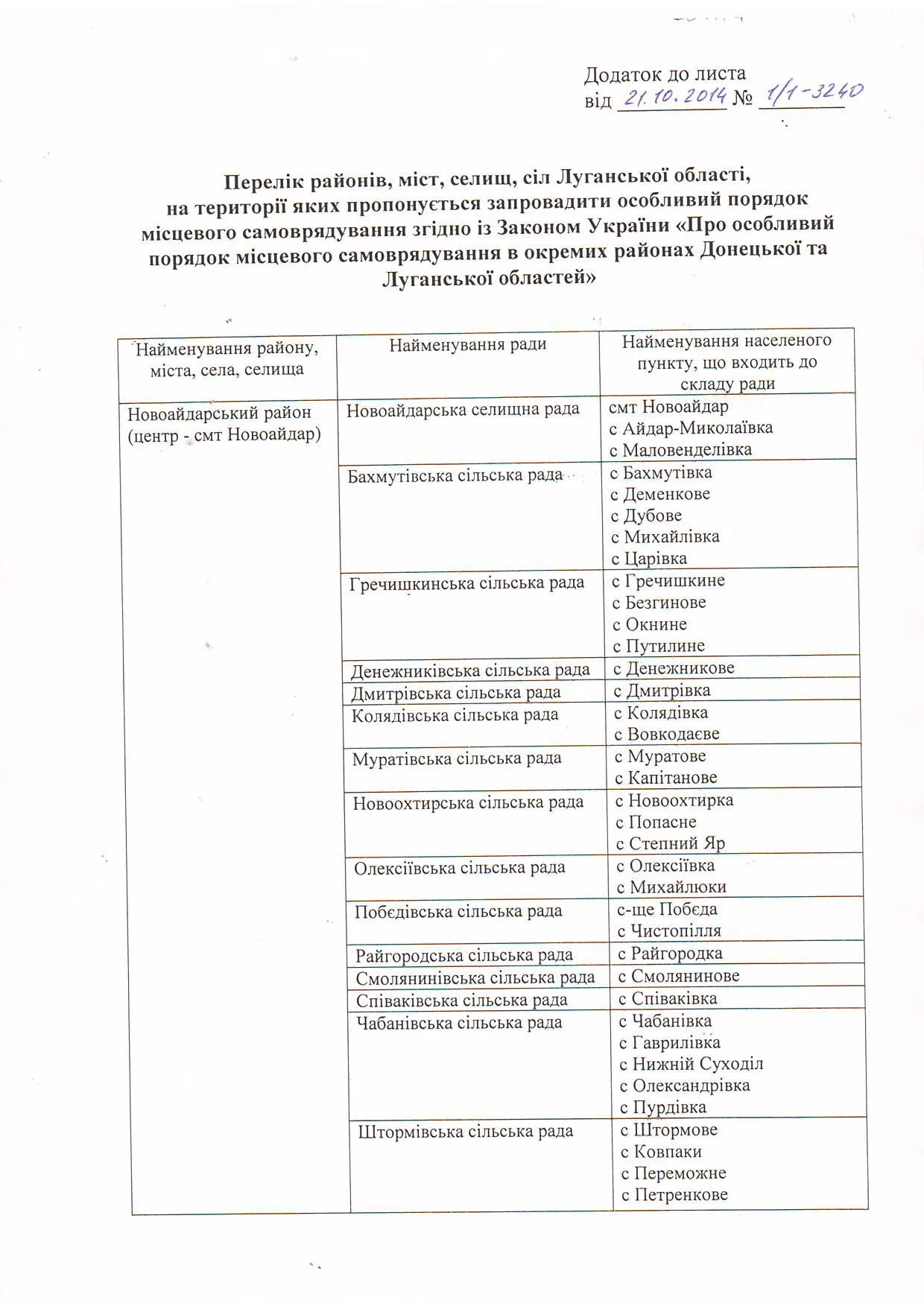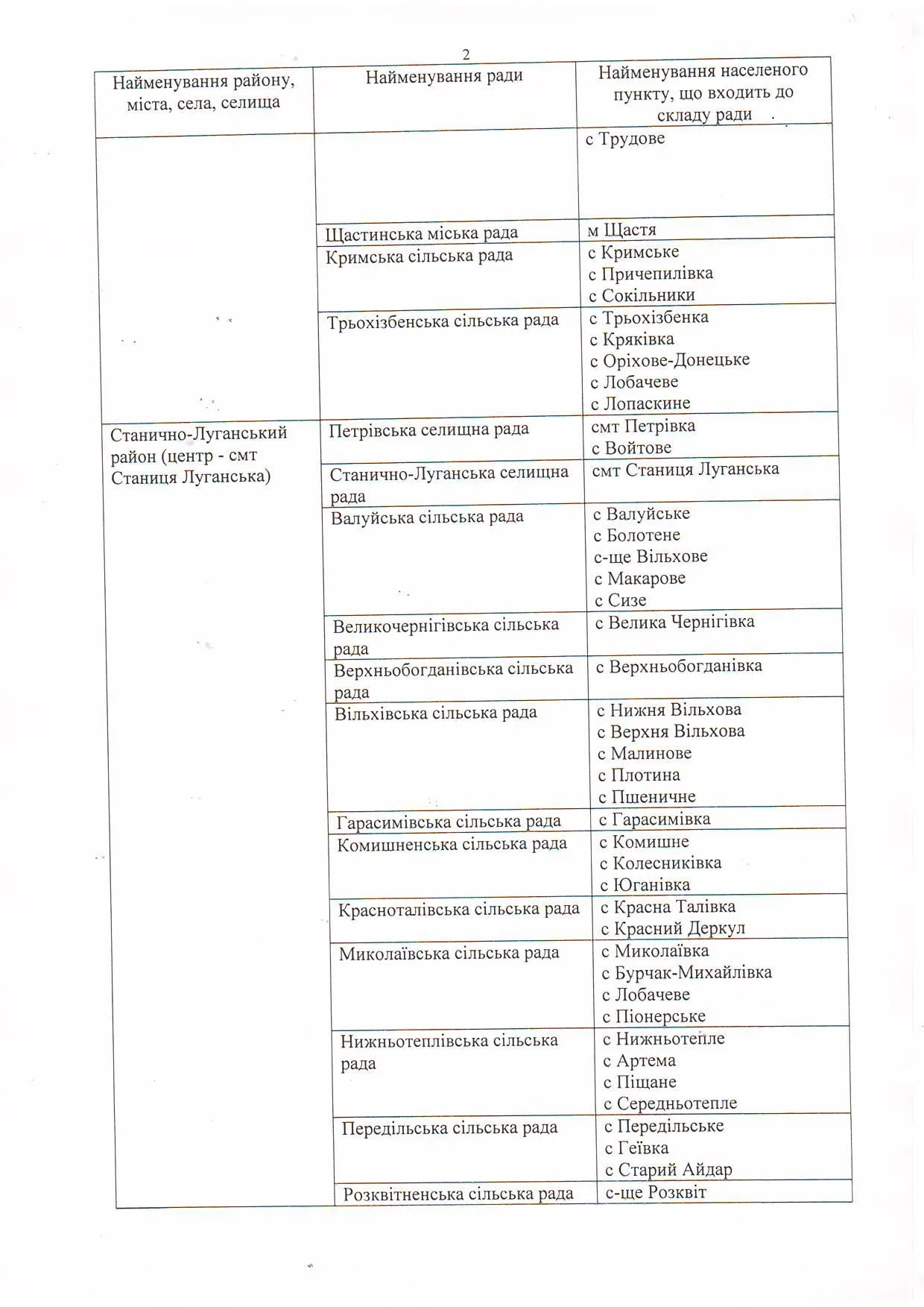 Усі вказані в переліку адміністративні одиниці перебувають на контрольованій Україною території, однак тут неможливо зібрати районну, селищну чи сільську раду, немає мера, сільського голови тощо. Вони втекли в Росію, перебувають в ополченні серед бойовиків або притягаються правоохоронними органами України до відповідальності за сепаратизм. Органи місцевого самоврядування неспроможні виконувати свої прямі функції, тому їх необхідно переобрати й перезавантажити,