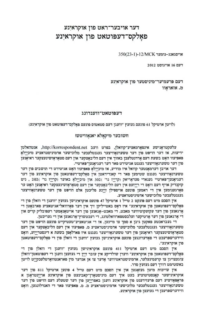Як повідомляє прес-служба, звернення написане мовою їдиш (єврейська мова германської групи, яка включена до переліку регіональних мов) – у відповідності до Закону “Про засади державної мовної політики” Ківалова-Колесніченка.