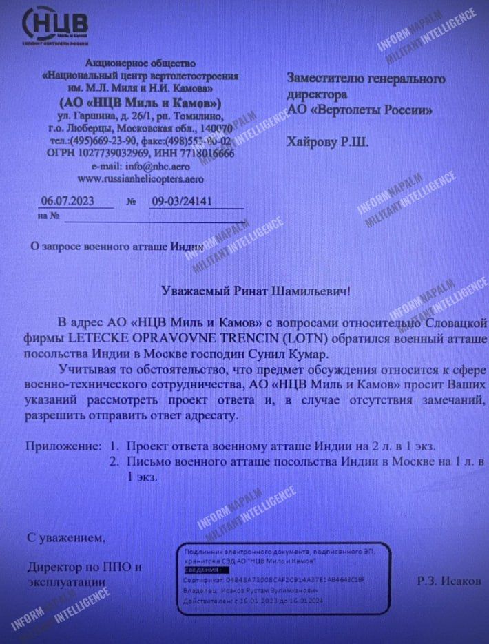 У листі йдеться про офіційний запит від військового аташе Індії в Москві Суніла Кумара щодо словацької компанії LETECKÉ OPRAVOVNE TRENČÍN (LOTN).