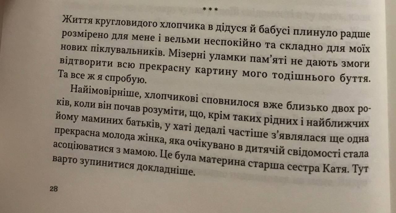 "Тьотя Катя, "мама", зʼявлялася щораз частіше й частіше. І в ті хвилі очікування її приїзду я журився. Досі памʼятаю своє місце біля вікна, де, засмучений, а іноді в сльозах, чекав на свою Катю. І памʼятаю радість в душі, коли вона поверталася. Вона ніколи не приїжджала з порожніми руками", – йдеться в книзі.