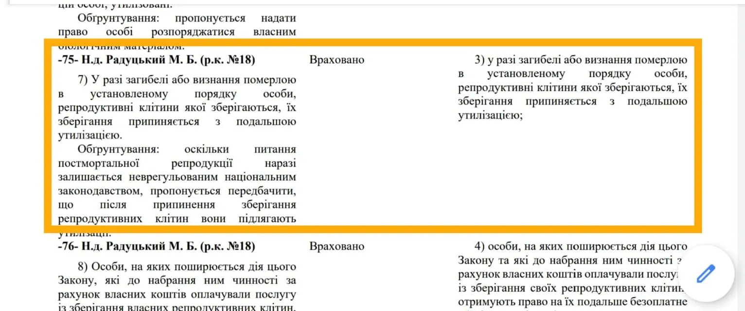Кріобанки не будуть утилізувати заморожений біоматеріал загиблих військових. Держава зацікавлена у продовженні роду усіма українцями. Медицина може і має допомагати. (...) Те, що в цьому законі не передбачено такої ж можливості для тих, хто загинув, – законодавча колізія, яку буде усунено у найкоротші терміни,