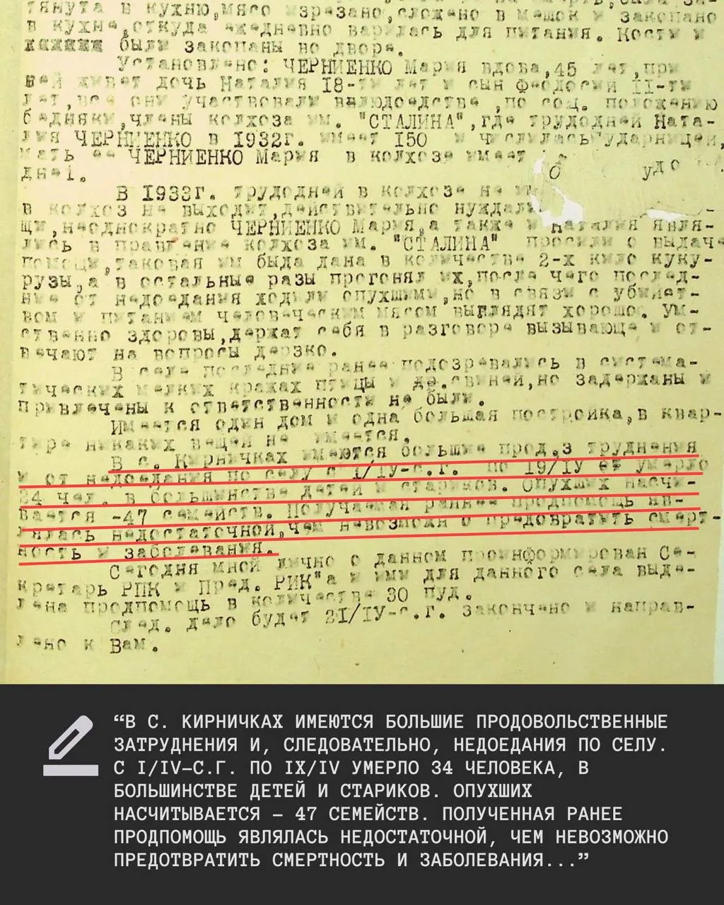 Як зазначають у МВС, більшість з понад тисячі справ, – про канібалізм. Вони стосуються періоду березня – червня 1933 року. Власне, це збігається з піком смертності, а також демонструє сплановане доведення українців до стану відчаю, а також переходу ними за межу людської моралі.