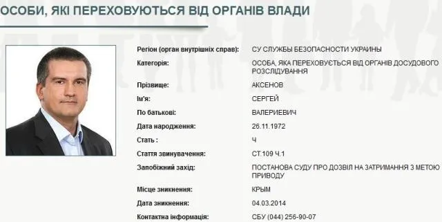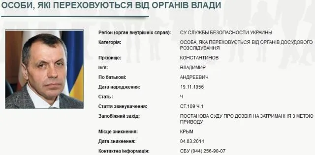 Слідче управління СБУ розшукує Аксьонова і Константинов як підозрюваних у скоєнні злочину за ч.1 с.109 Кримінального кодексу України — "дії, вчинені з метою насильницької зміни чи повалення конституційного ладу або захоплення державної влади".