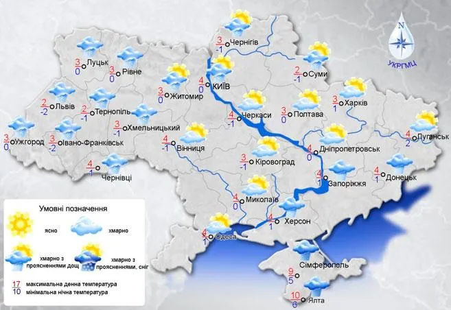 Удень без істотних опадів, лише у західних, північних областях та Приазов'ї місцями невеликі опади. Температура вночі від 2° тепла до 3° морозу, вдень 1-6° тепла.