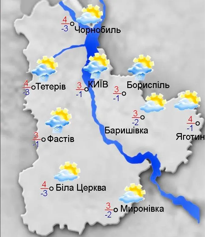 У Київській області - хмарно з проясненнями. Невеликий мокрий сніг (вдень місцями). На дорогах подекуди ожеледиця. Вітер південно-західний, 7-12 м/с. Температура вночі від 2° тепла до 3° морозу, вдень 1-6° тепла. У Києві температура вночі 0-2° морозу, вдень 2-4° тепла.